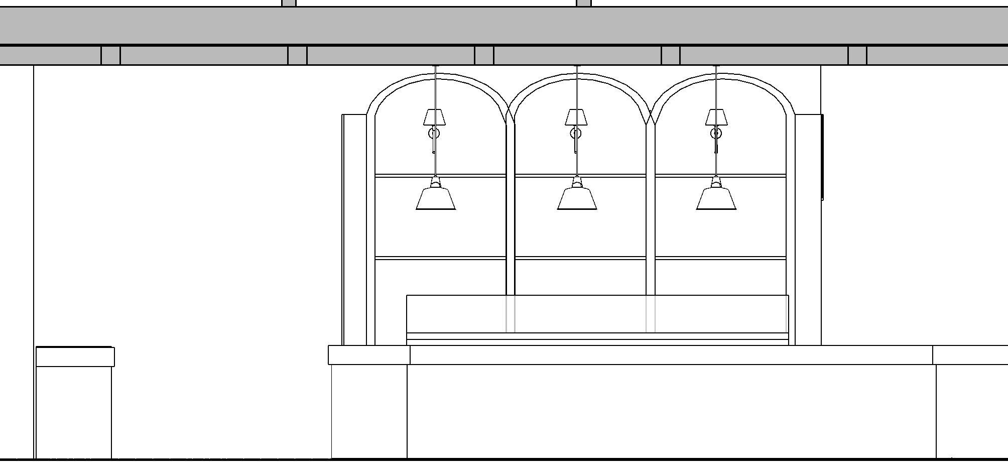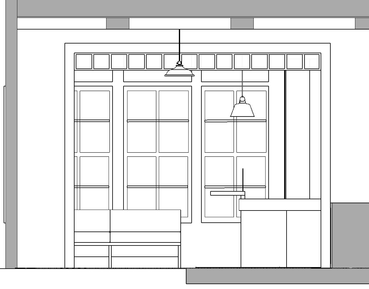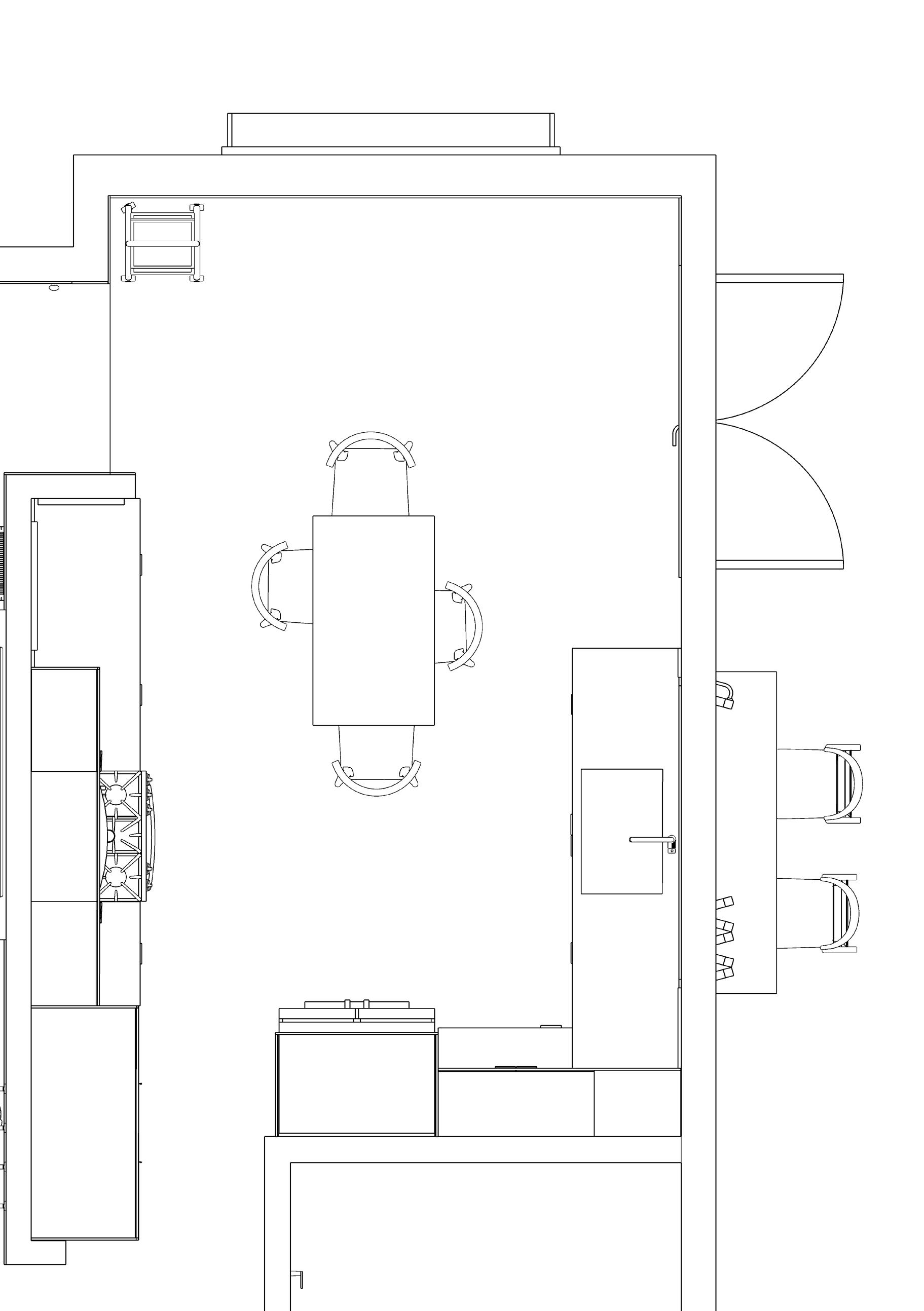 ^ One point perspective showing the cabinet layout surrounding refrigerator.
