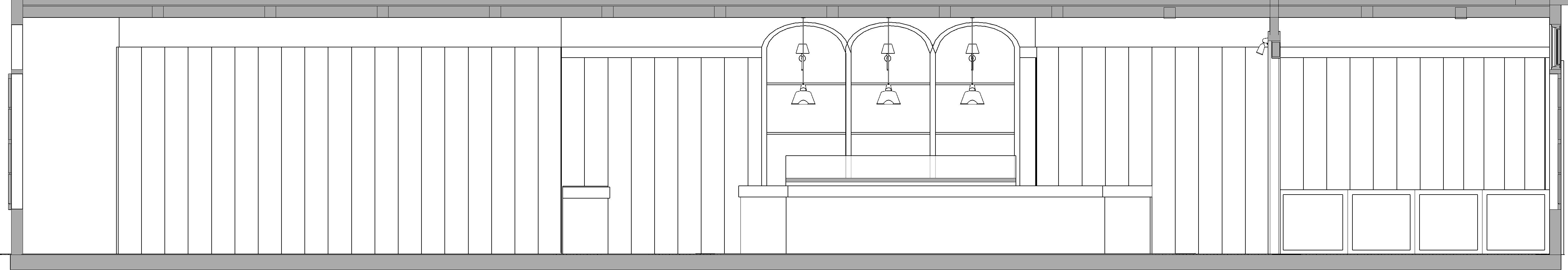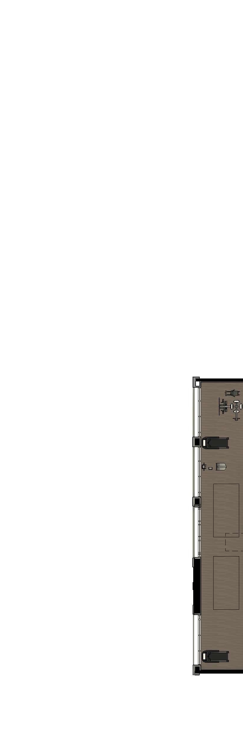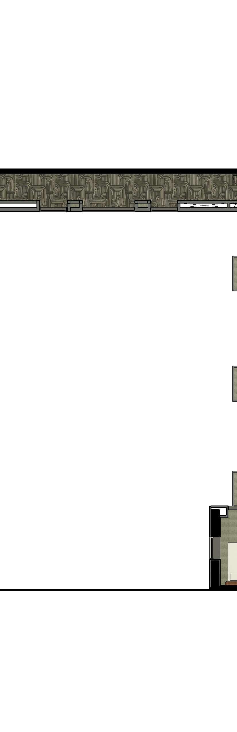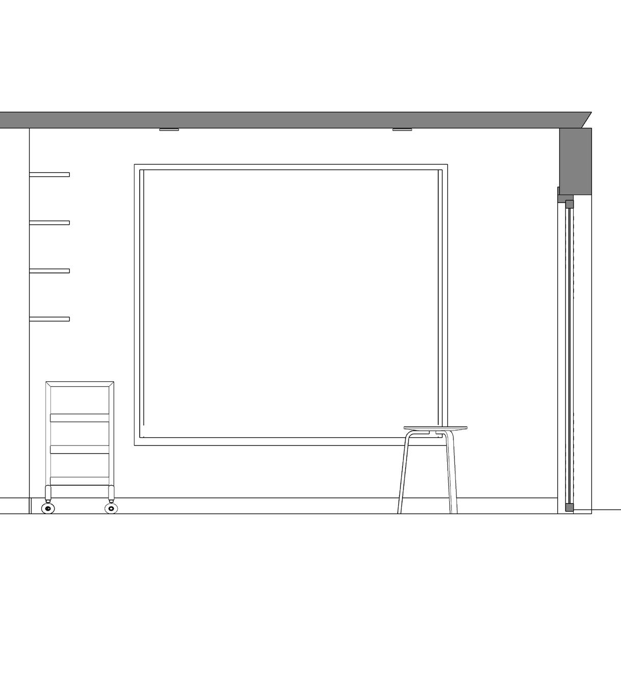 ^ One point perspective showing the cabinet layout surrounding refrigerator.