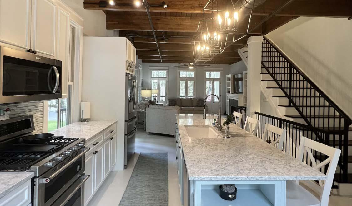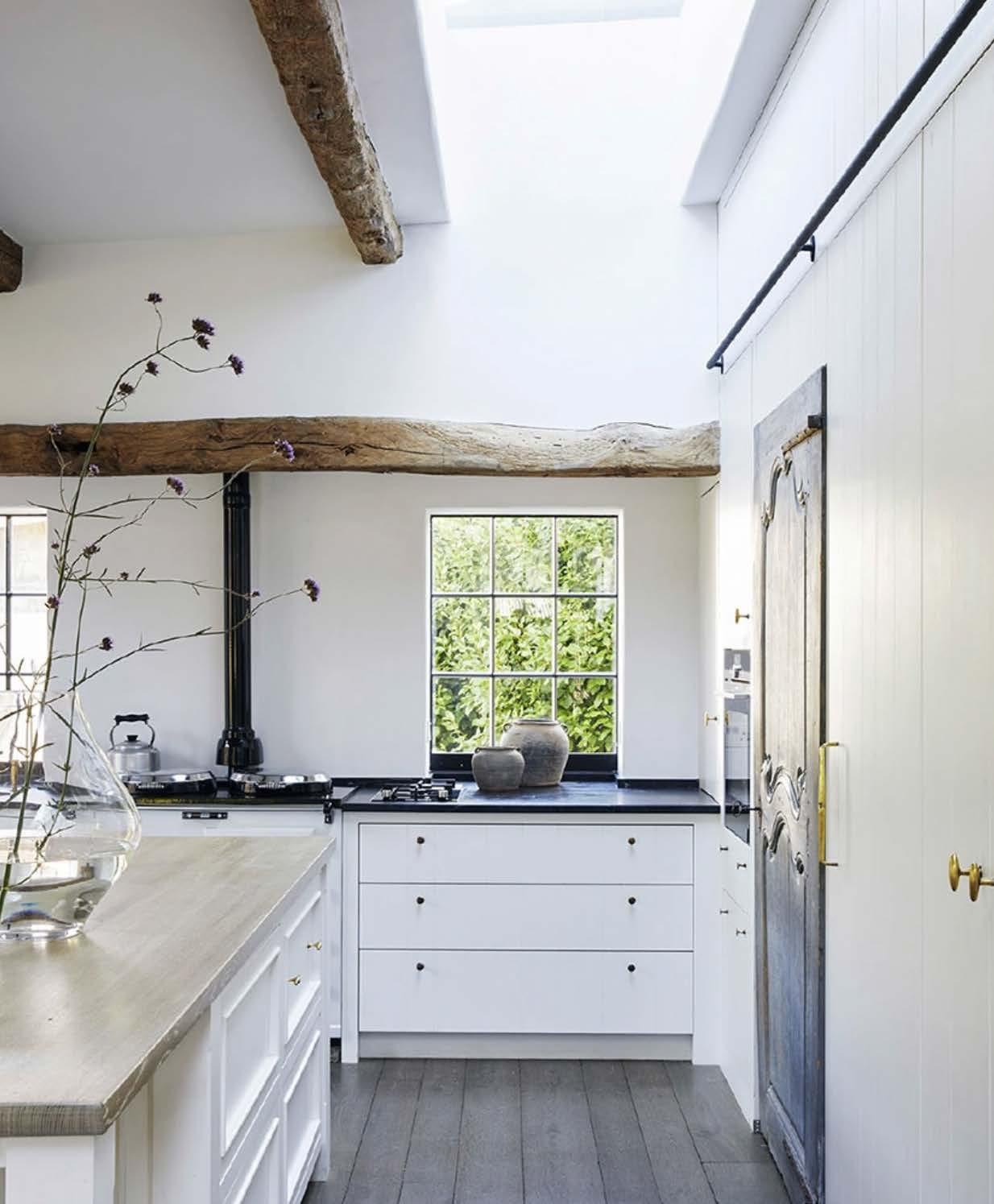 Shows beautifully the combo of grey counters, warm wood beams, white cabinets
