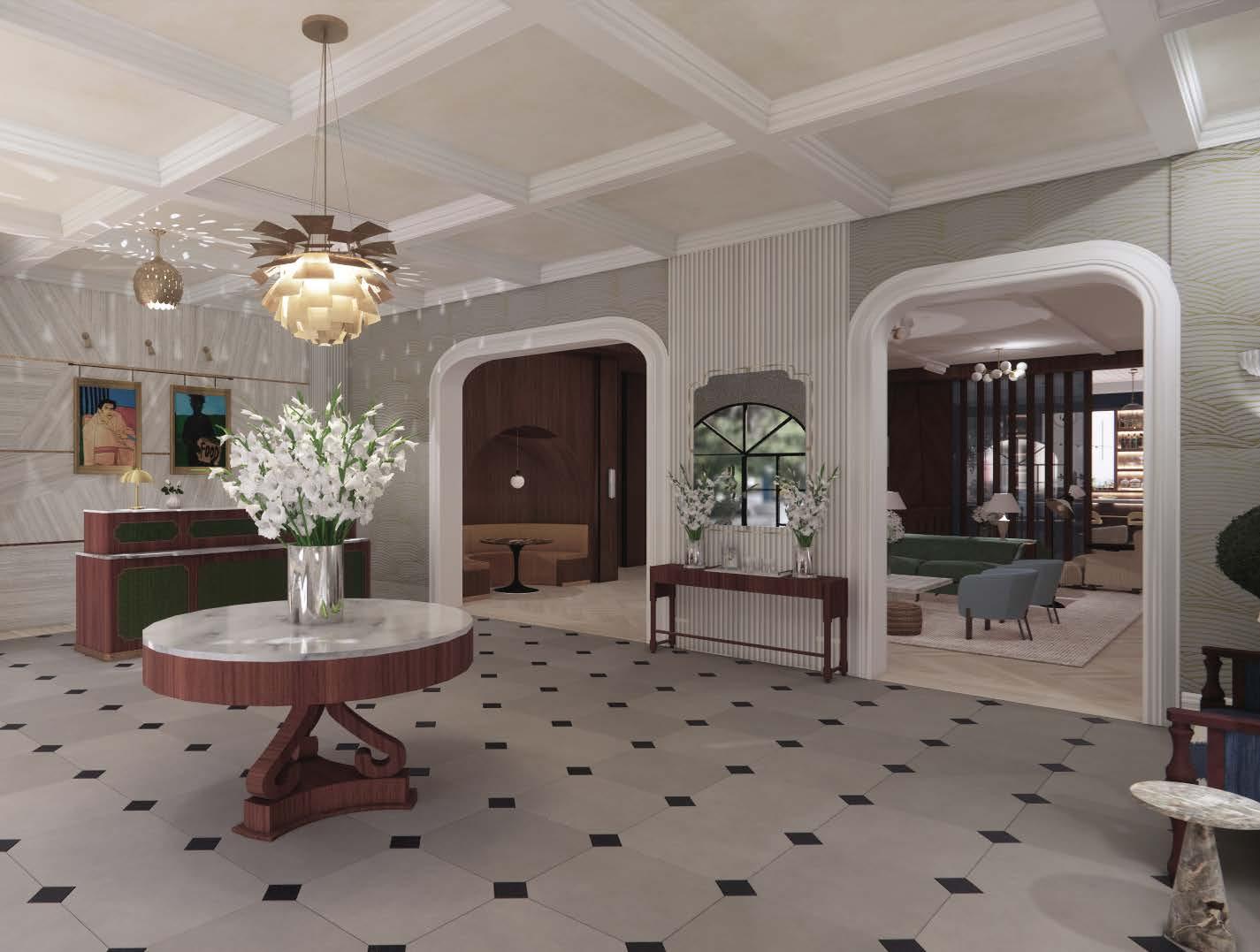 > Front lobby and with custom check in desk. Structural concrete pillars are covered in fluted plaster. Pierre Frey Yangzi wallcoverings.