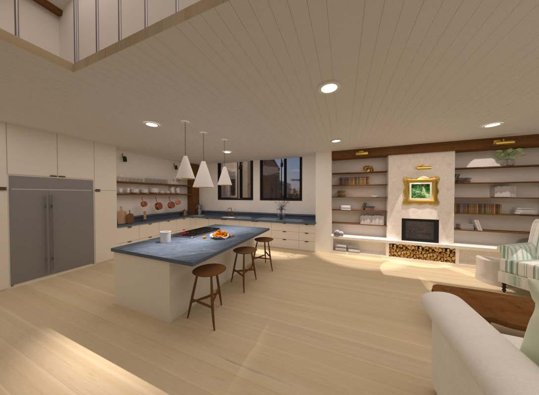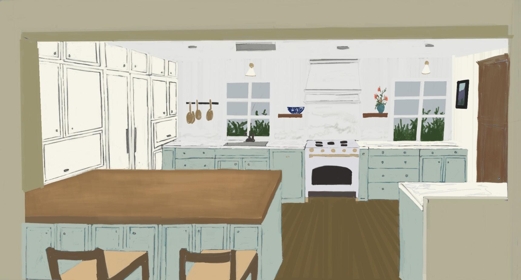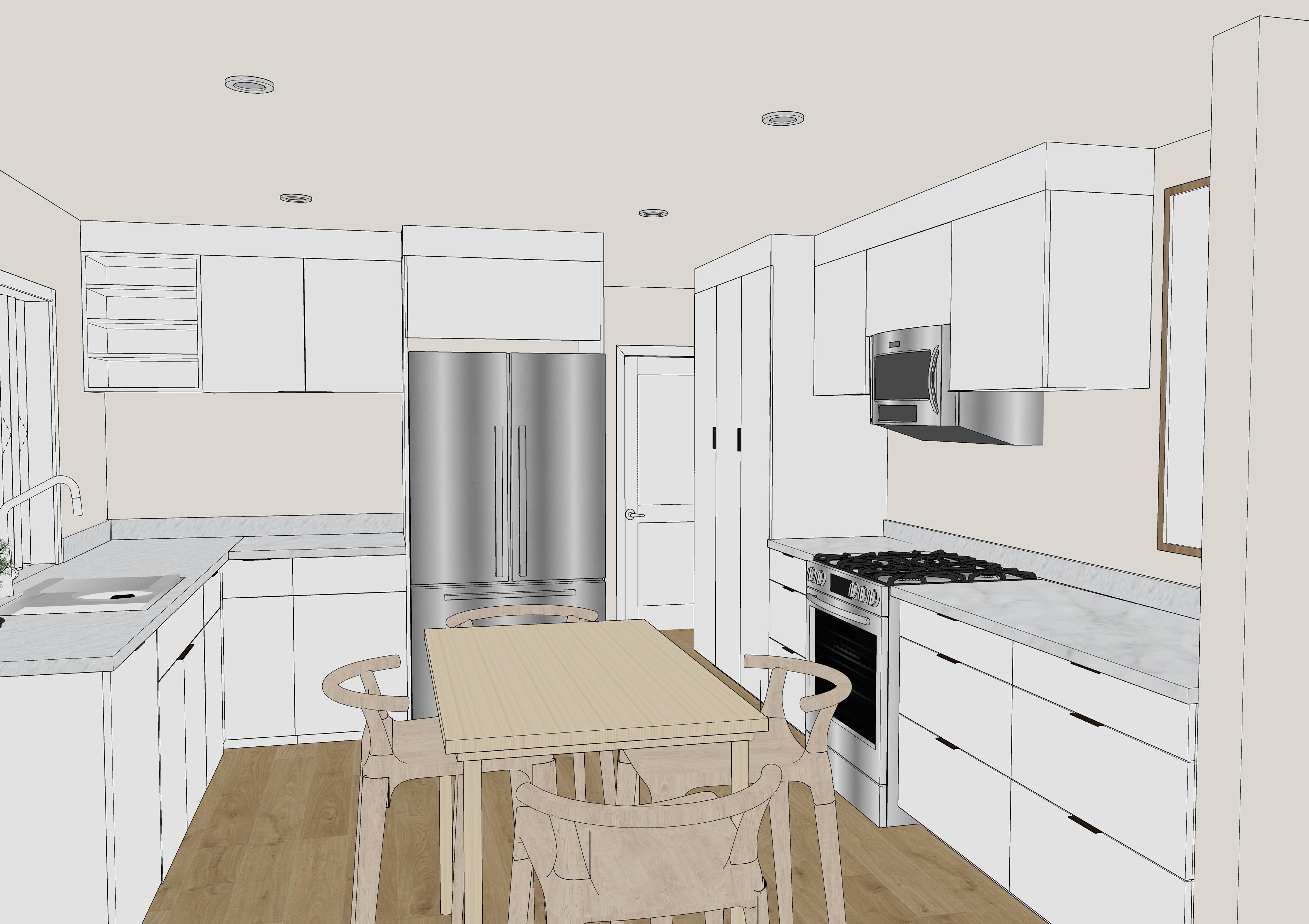 ^ Preliminary kitchen render. The final design included a narrow portable island and not this kitchen table.