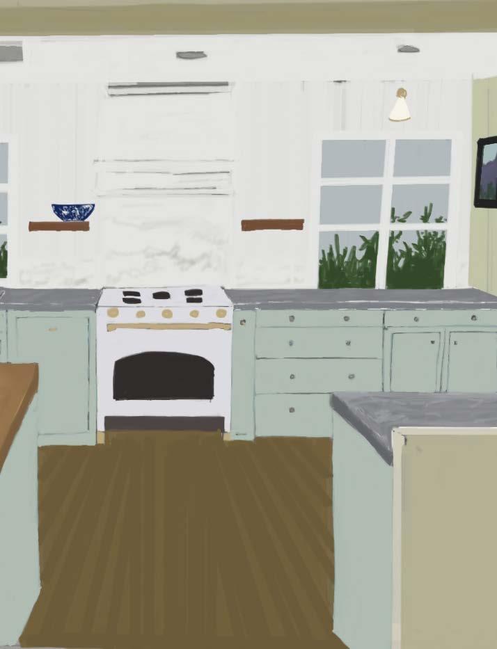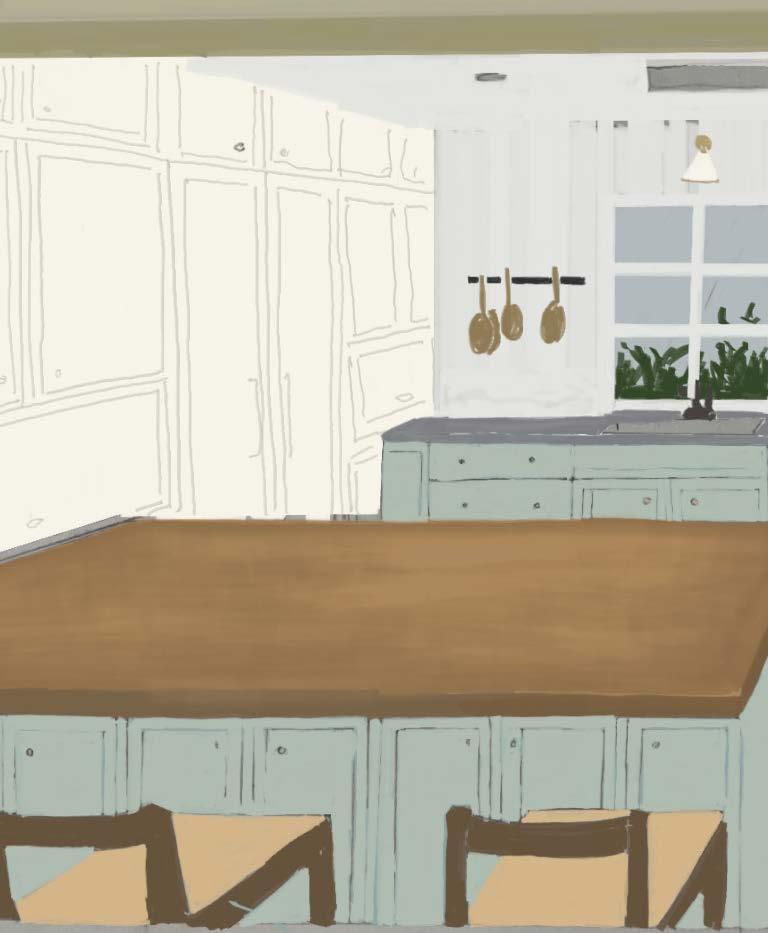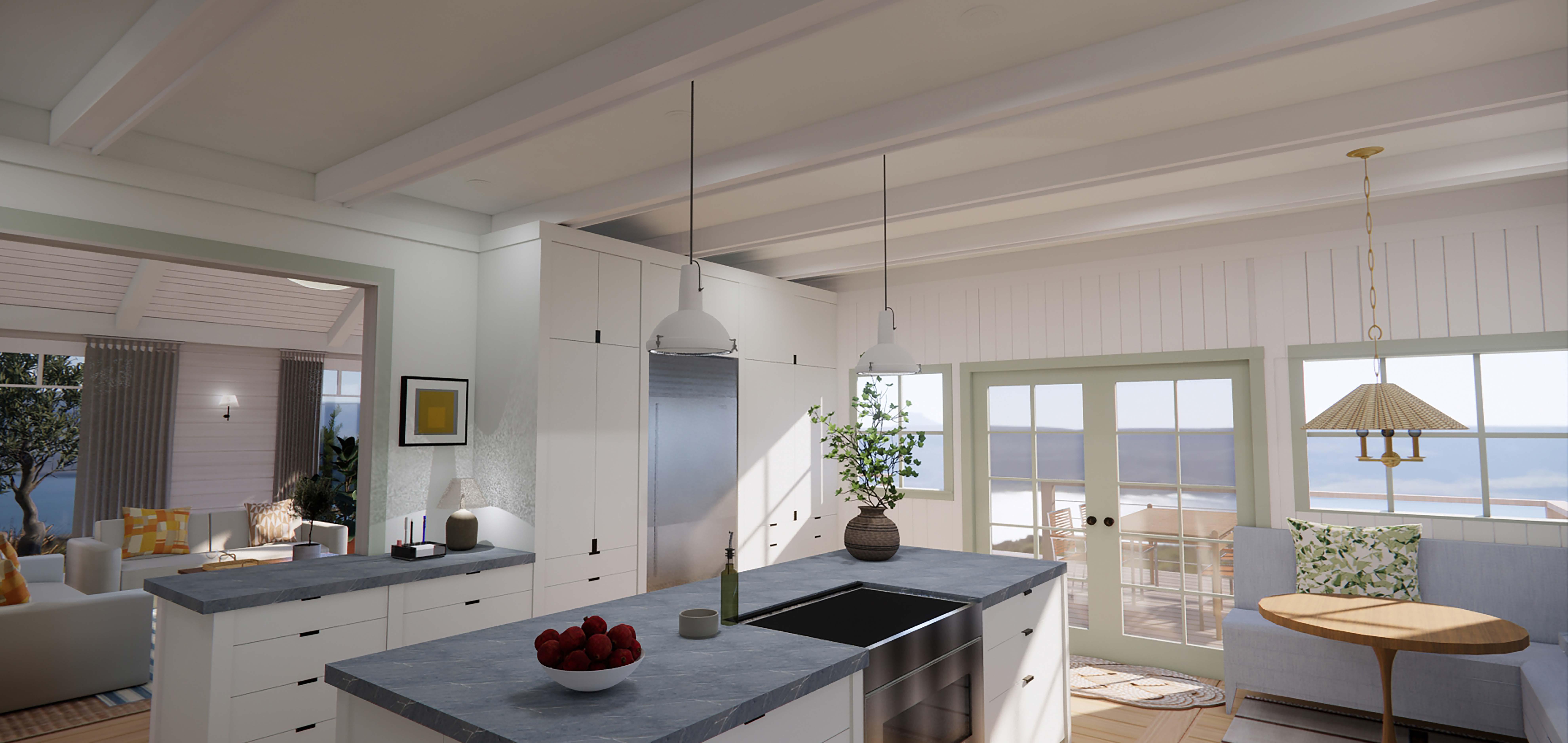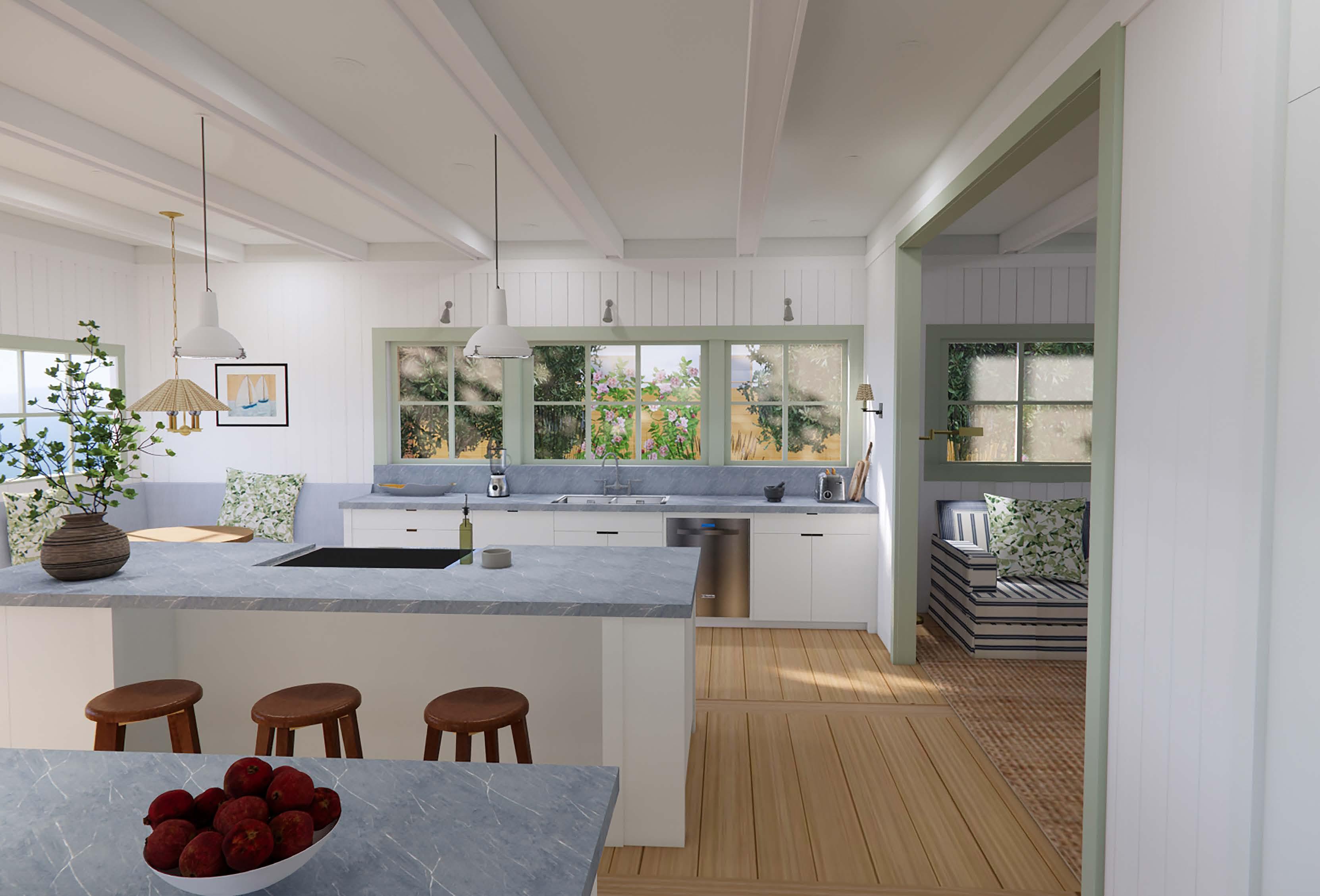 ^ Preliminary kitchen render. The final design included a narrow portable island and not this kitchen table.