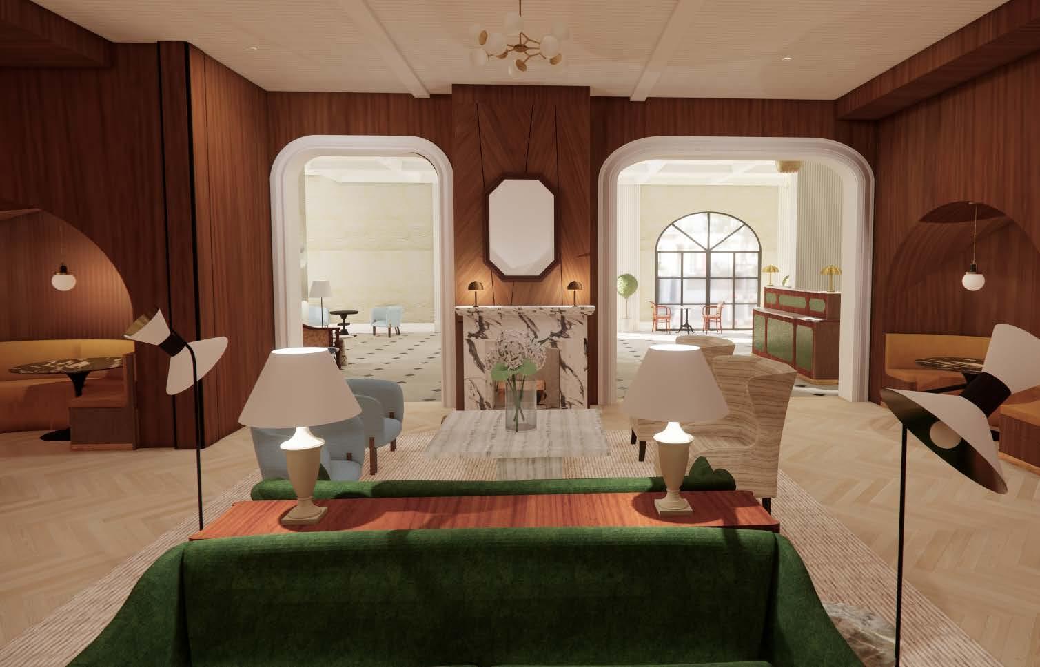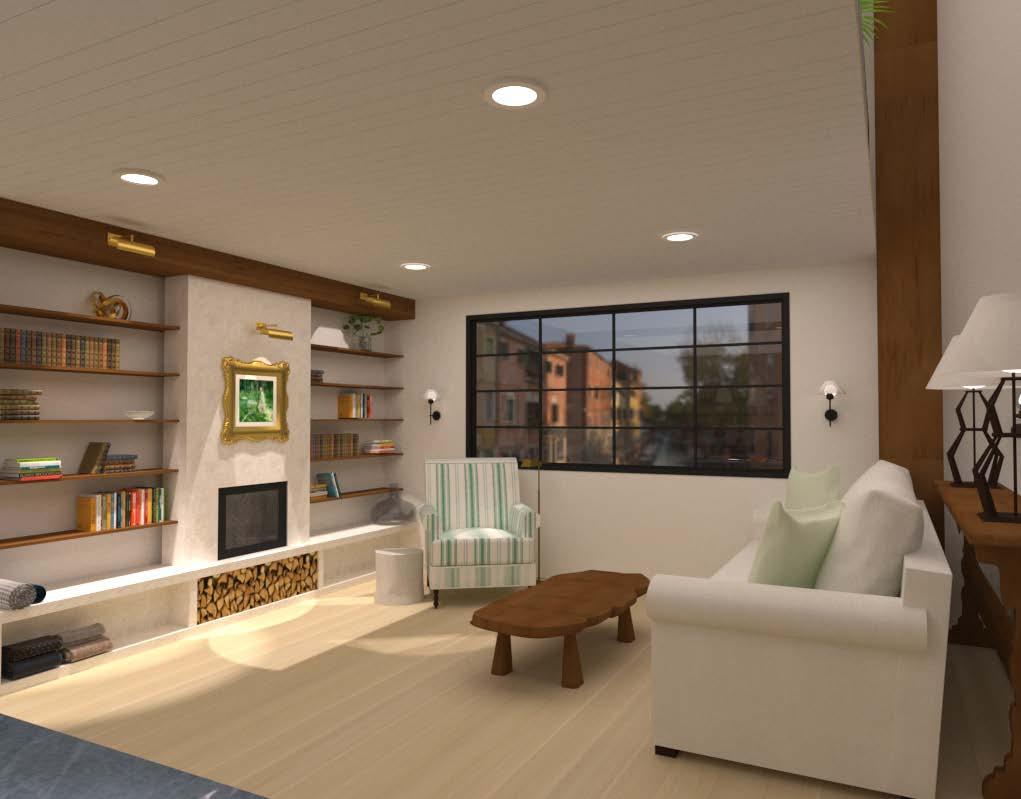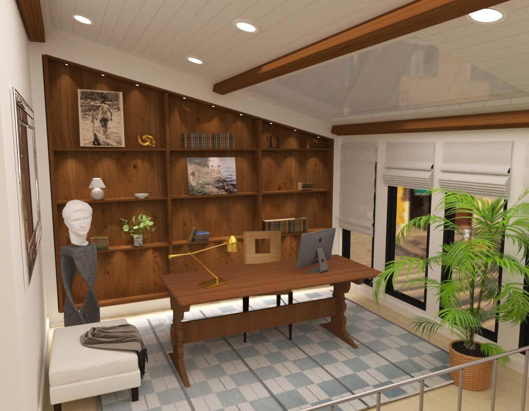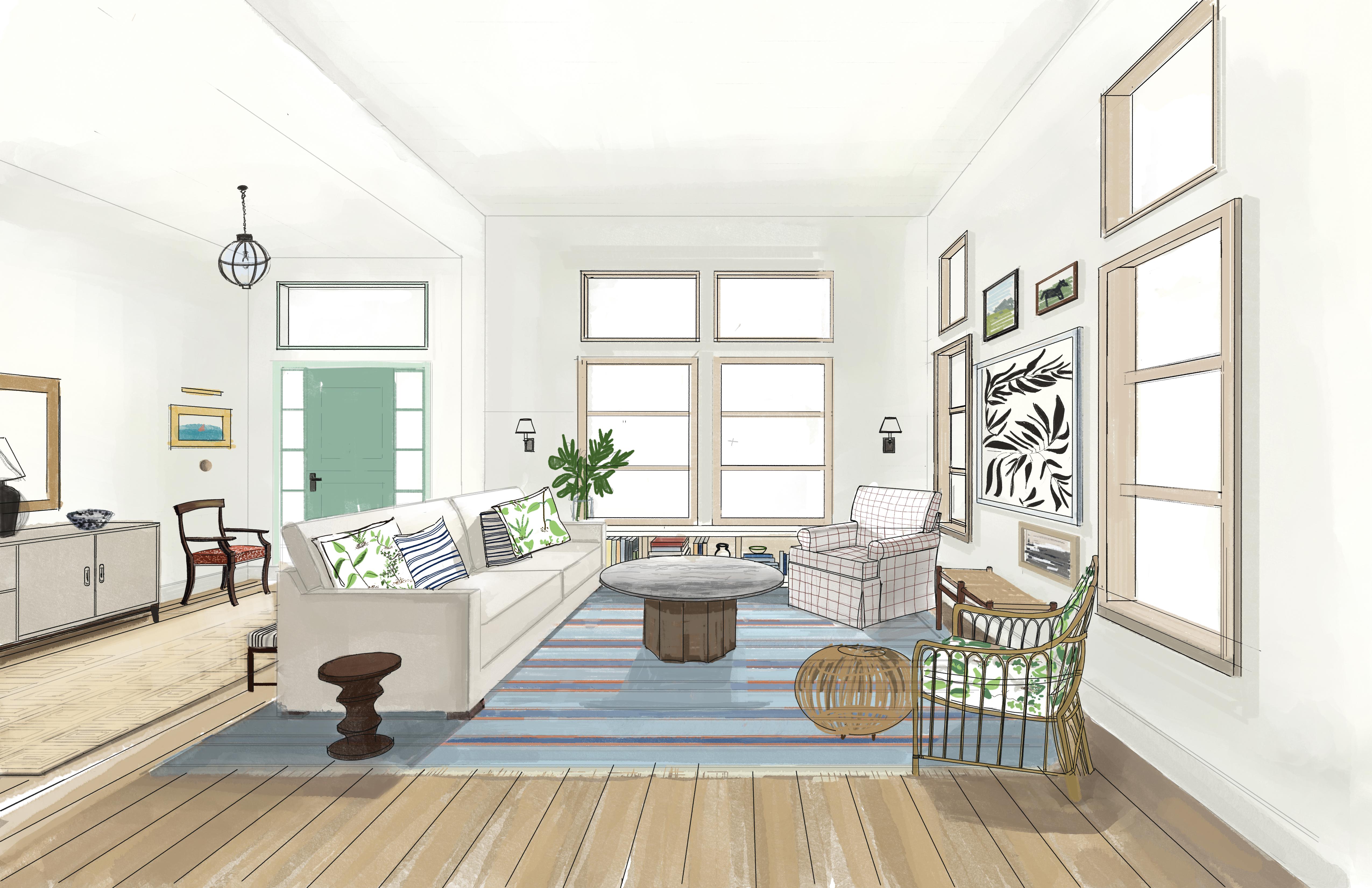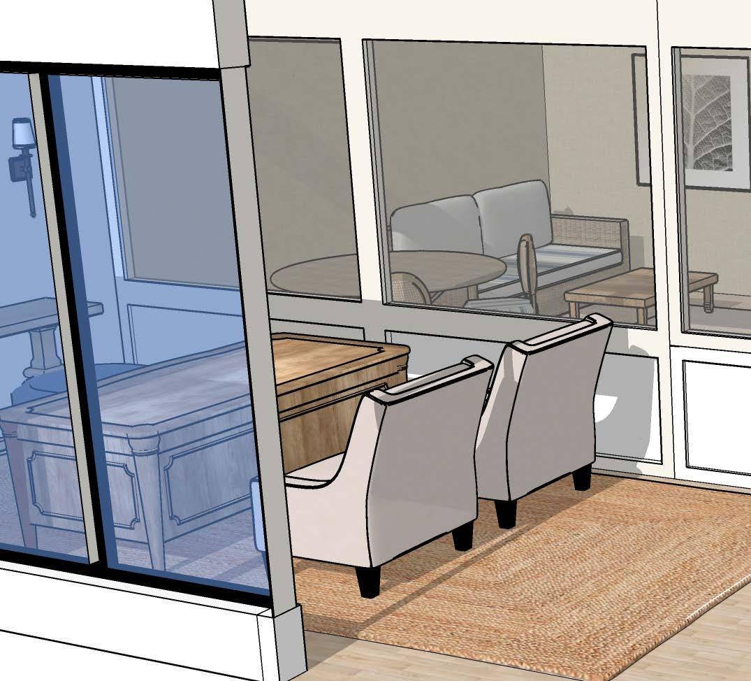 < Personal project: A living room design render and furnishing selections which includes antique and custom furnishings, custom millwork, a new front door configuration to allow more natural light, new windows and lighting, a Samsung Frame television surrounded by art to make the TV less of a focal point.