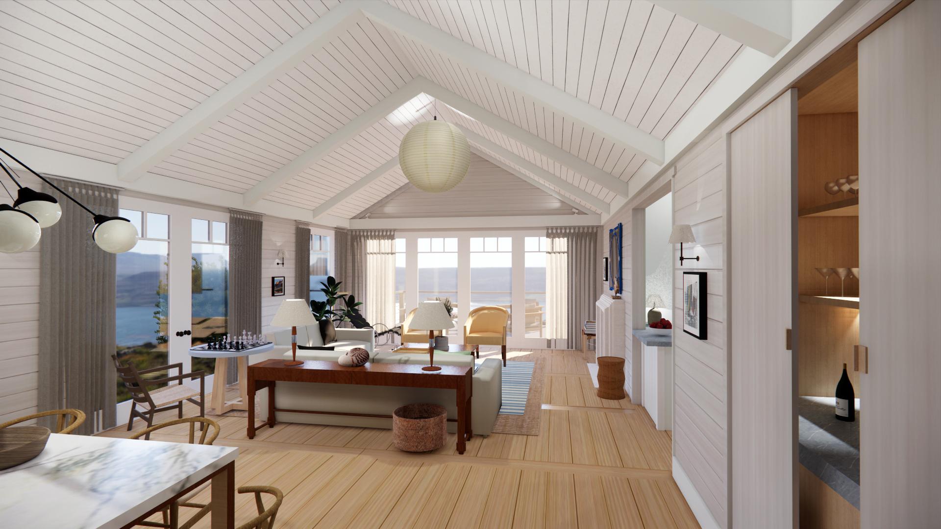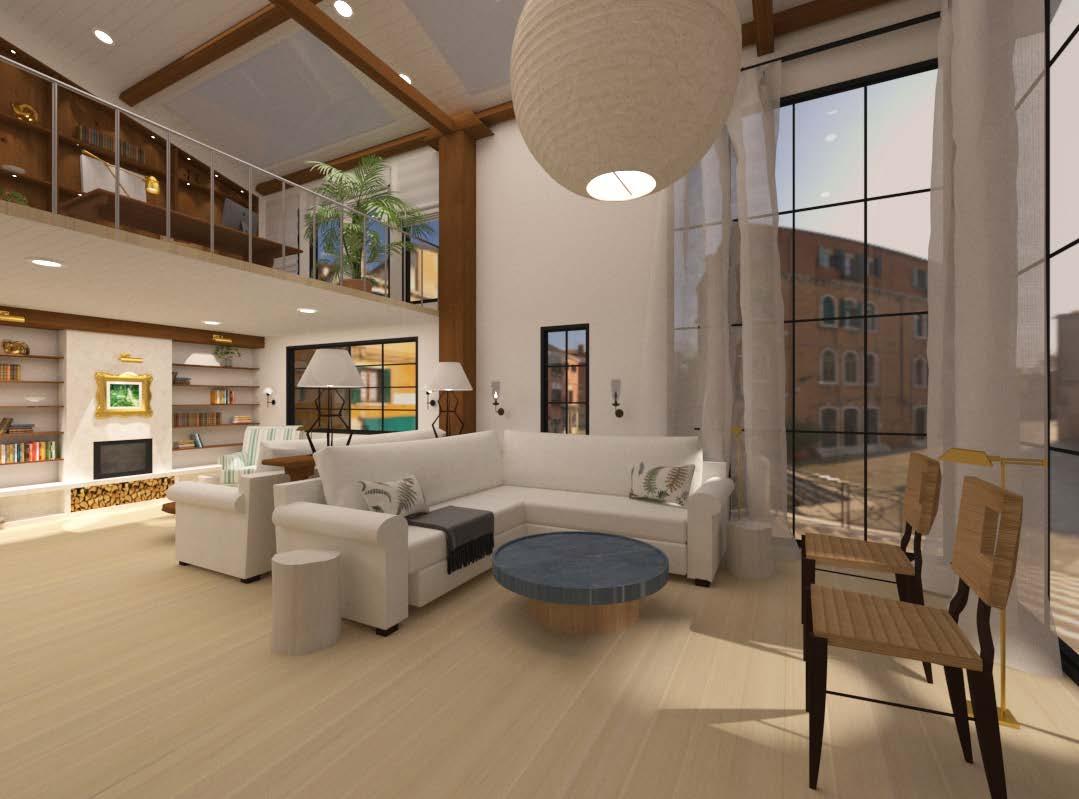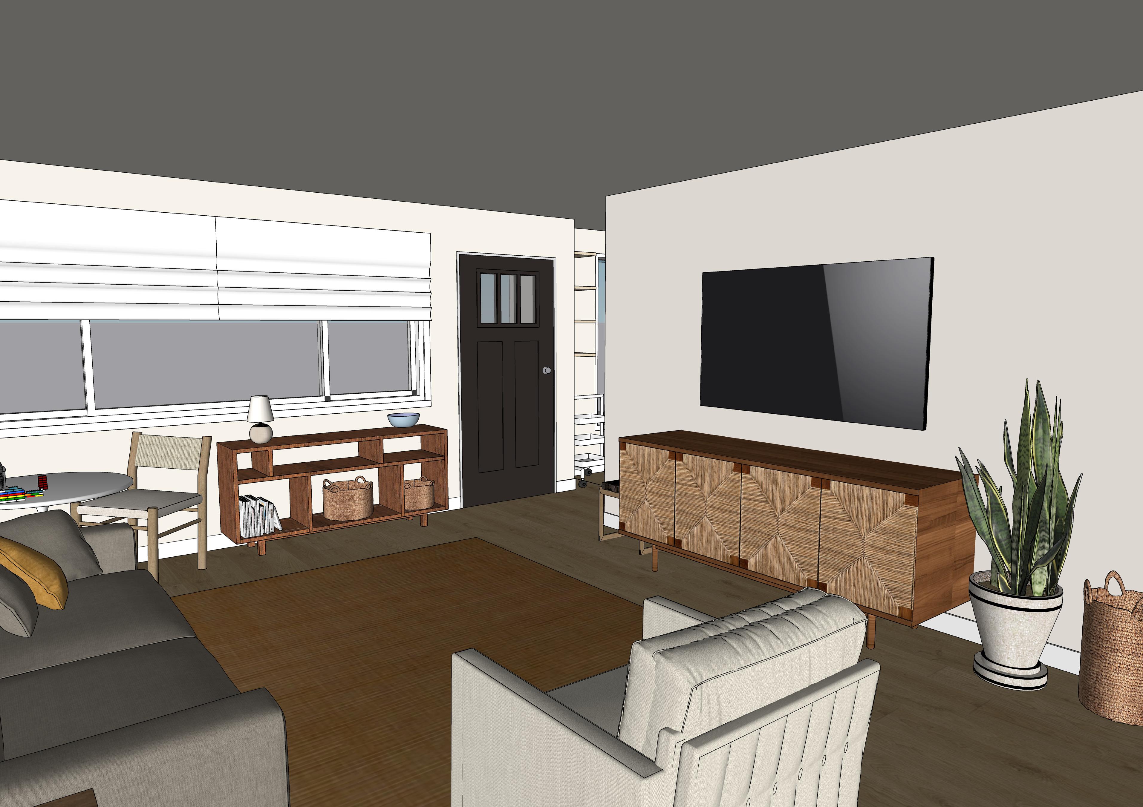 ^ Preliminary living room and entry render. The home lacks an entry vestibule and needs creative solutions for storage that would normal belong in an entry.