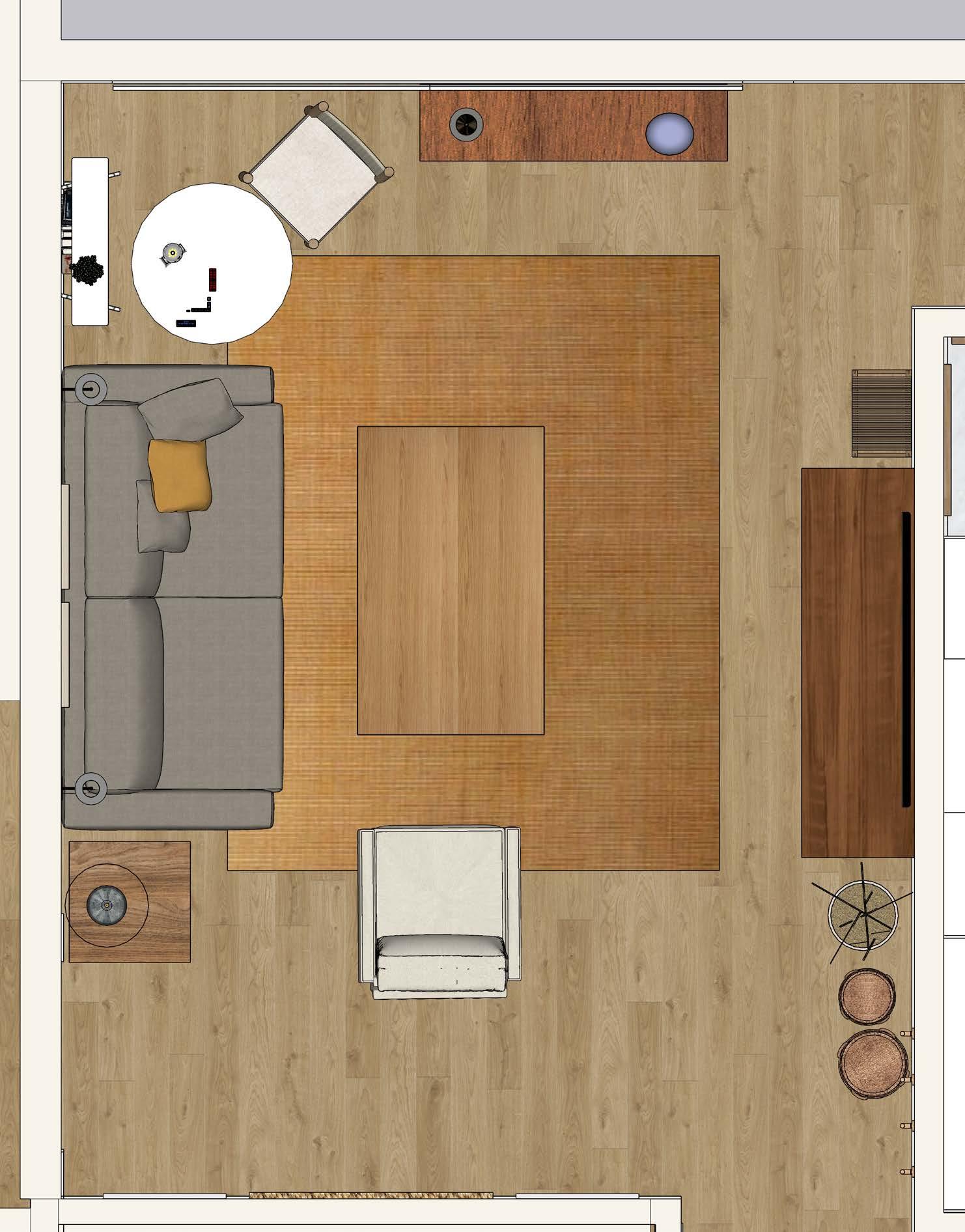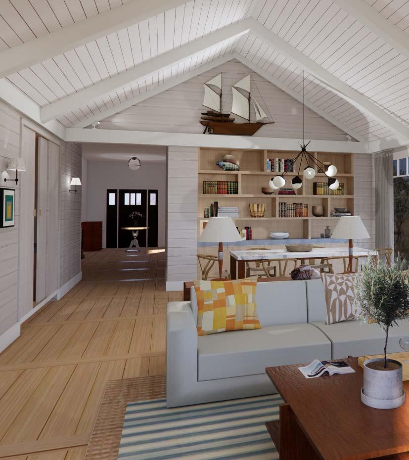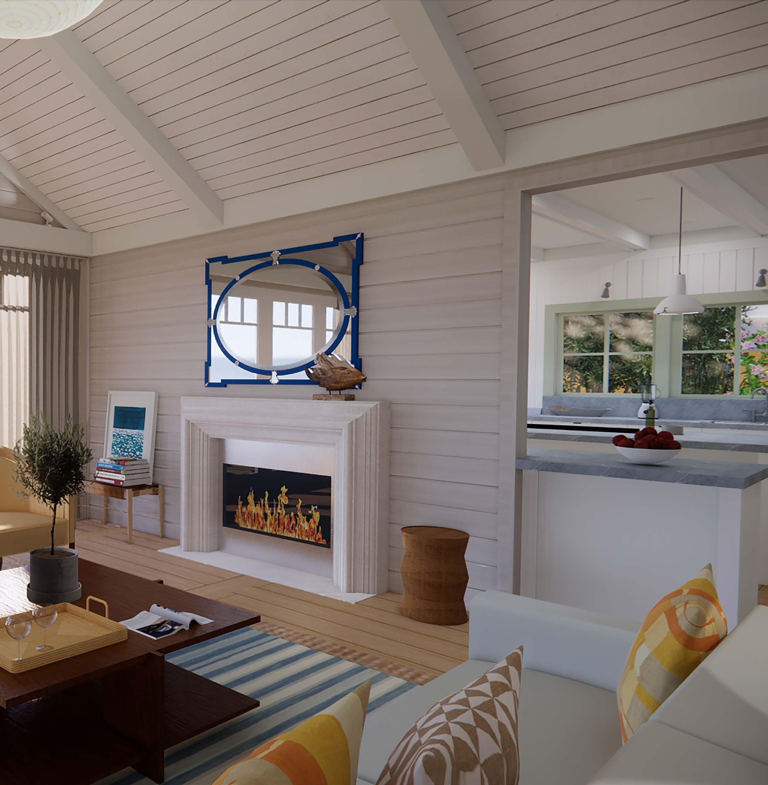 ^ Preliminary living room and entry render. The home lacks an entry vestibule and needs creative solutions for storage that would normal belong in an entry.