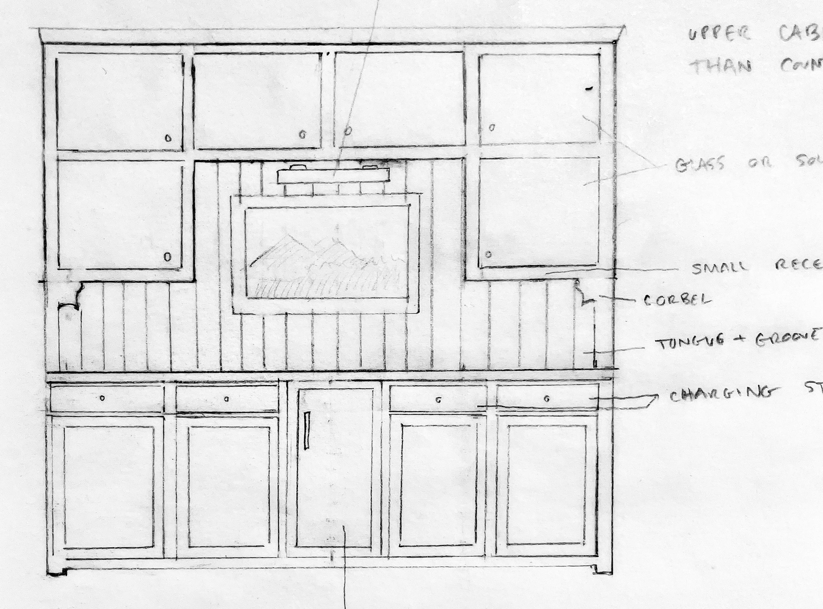 • Sitting room cabinetry could be be a color with a wood counter top or white with a wood counter top.
