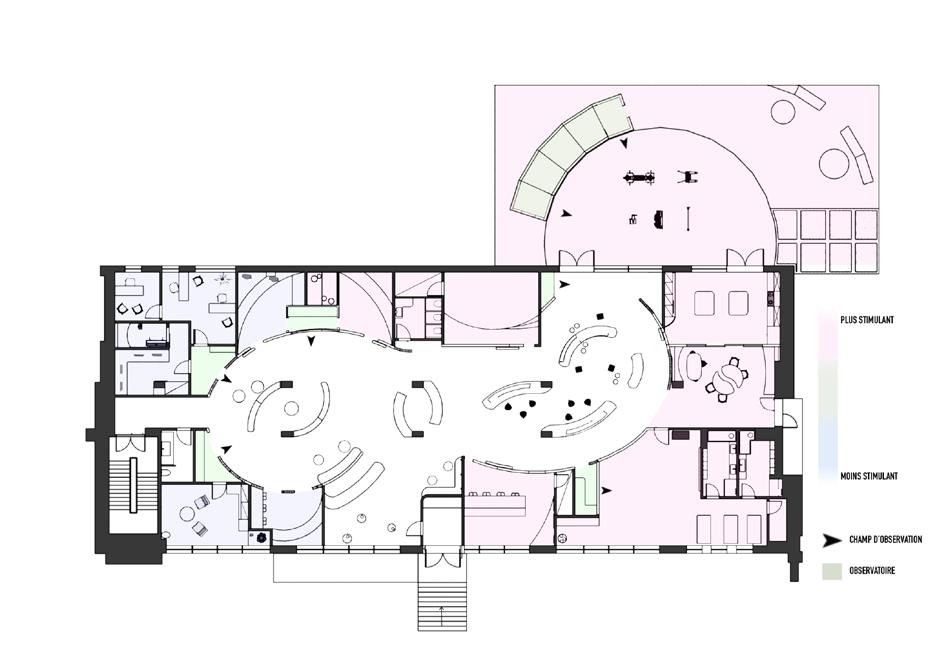 Stratera, synonymous with Yin and Yang, is the result of a renovation project for the library of the Faculty of Design. Now transformed into a center for young adults with autism, it focuses on their integration into the outside world and sensory zoning. The aim is to achieve inclusion of neurodiversity through a balanced space. This is an environment that allows young individuals with autism to connect with their community and normalize their spectrum on a daily basis. It is a day center that enables them to experience creative, relaxing, and community-oriented spaces while remaining within their comfort zone.