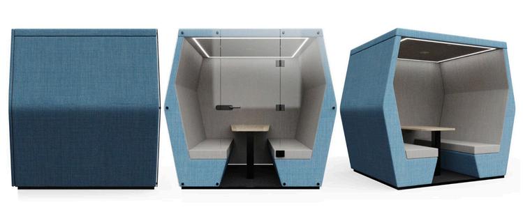 The Bill Offices Booths are an angular range of fully upholstered office meeting pods. The minimal lines of the Bill create both comfort and a focal point for any interior. Available in a 2 person, 4 person or 6 person size in an open design or with an end wall and/or glass doors.