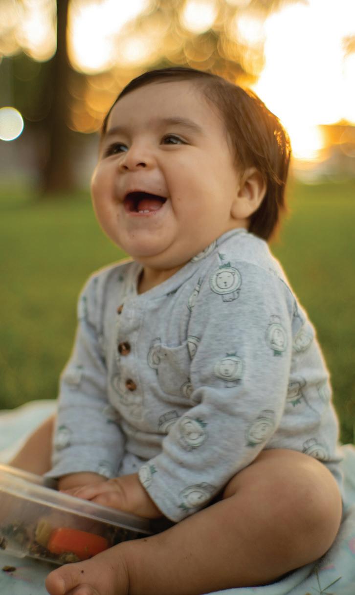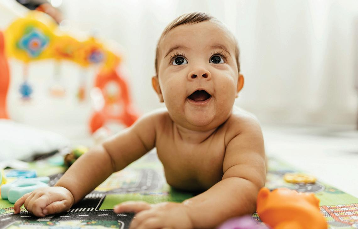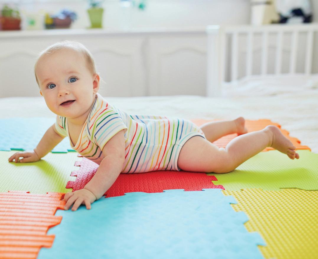• Gives baby time to play while lying on his/her tummy. This “tummy time” develops upper body strength.