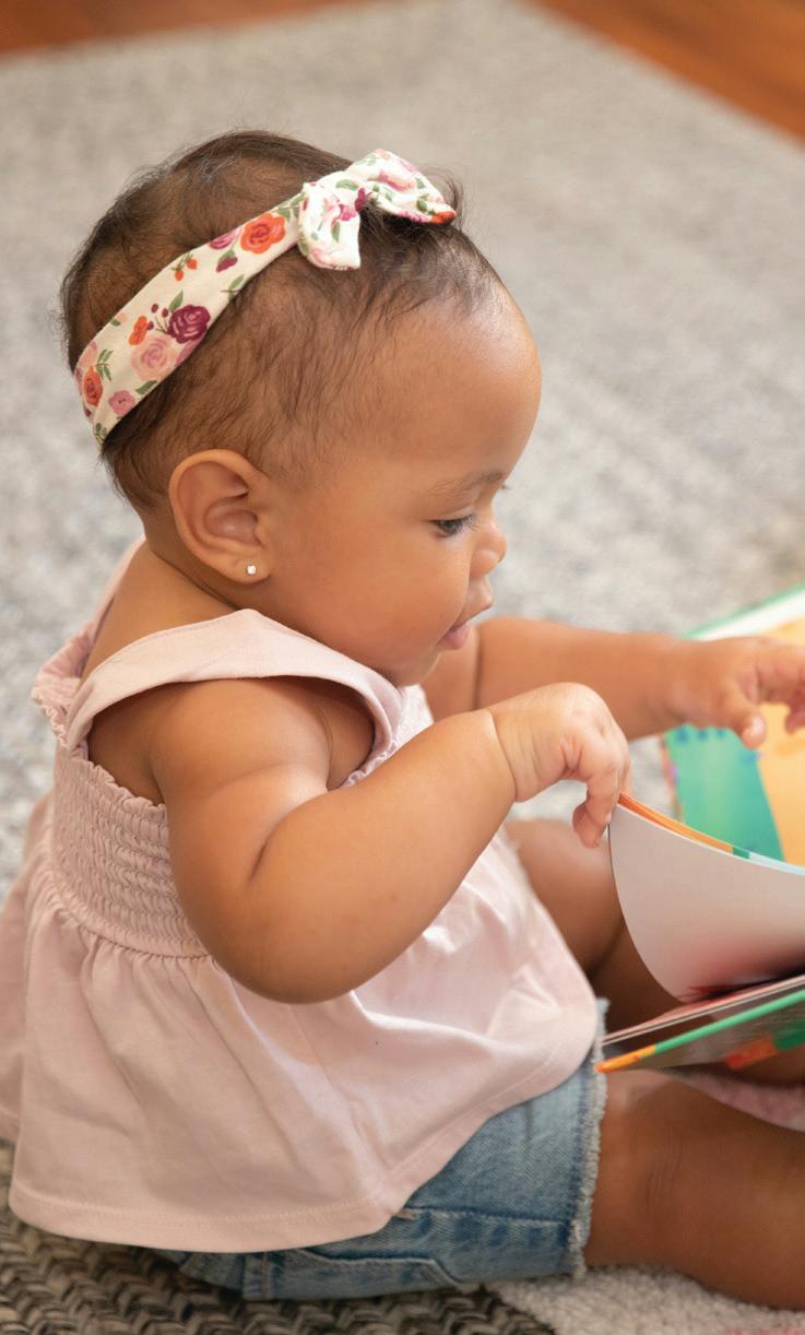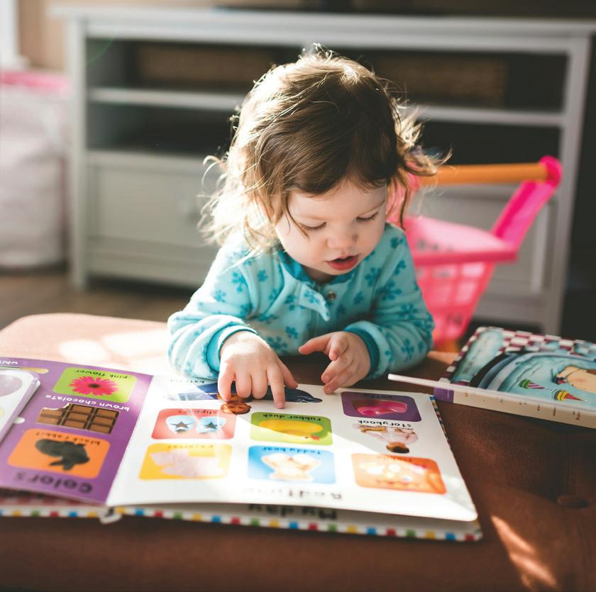 Make sure your child sees and hears books. Having many books at home they can explore is a great way to help them learn letters and words. Reading with them every day will help your child connect talking and reading.