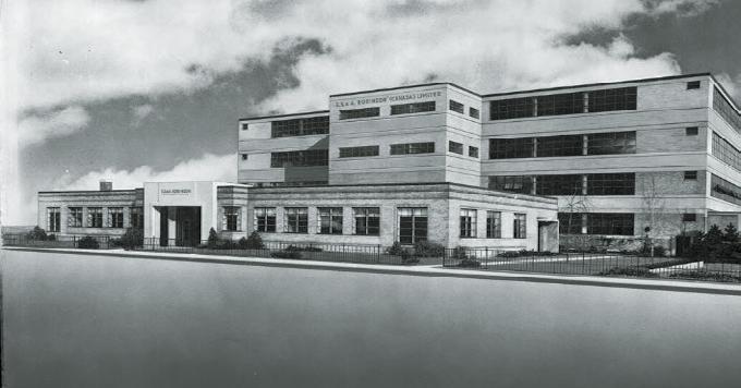 For over 20 years, Ron worked for E.S. & A. Robinson, makers of flexible packaging materials. The large plant on Laird Drive has now disappeared, with the Leaside Village shopping area and the Telus building taking its place. Founded by Elisha Smith Robinson and his brother Alfred in Bristol, UK, in the 1840s, it quickly became a leader in the manufacture of grocery store paper bags. The Leaside location opened in 1936 and for the next 60 years produced catalogues, cookie bags, calendars, beer labels and