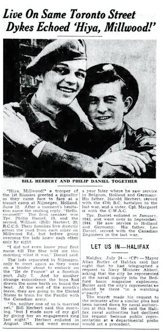 “‘Hiya, Millwood!’ a trooper of the 1st Hussars greeted a signaller as they came face to face at a transit camp in Nijmegen, Holland... After a moment’s hesitation came the smiling reply, ‘Hello, yourself!’ The first speaker was Tpr. Philip Daniel, 19 and the second William (Bill) Herbert, 20...Their families live directly across the road from each other on Millwood Rd., but before going overseas the lads knew each other only by sight...”