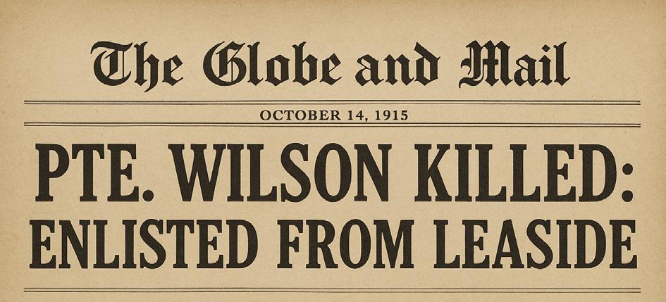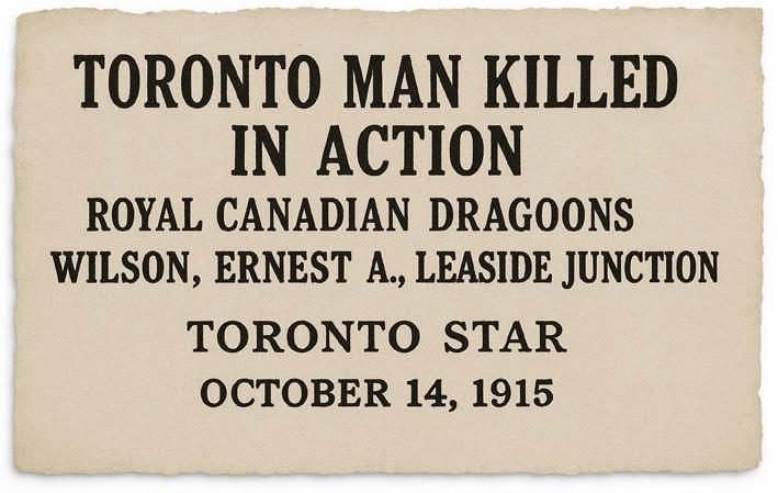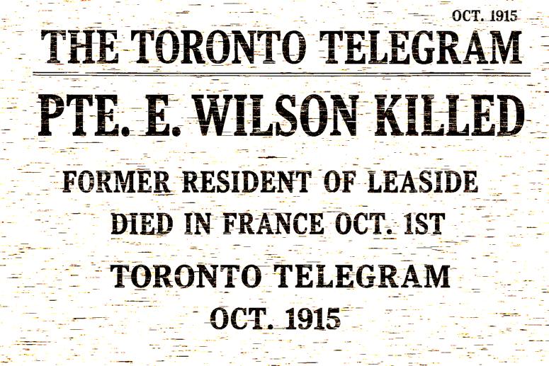 Aerodrome, I know of only one confirmed and documented case of a Leaside resident who was killed in action during WWI. His name was Ernest Alex Wilson, and his story, like that of so many other young men who fought in that senseless and avoidable conflict, was a sad and tragic one.