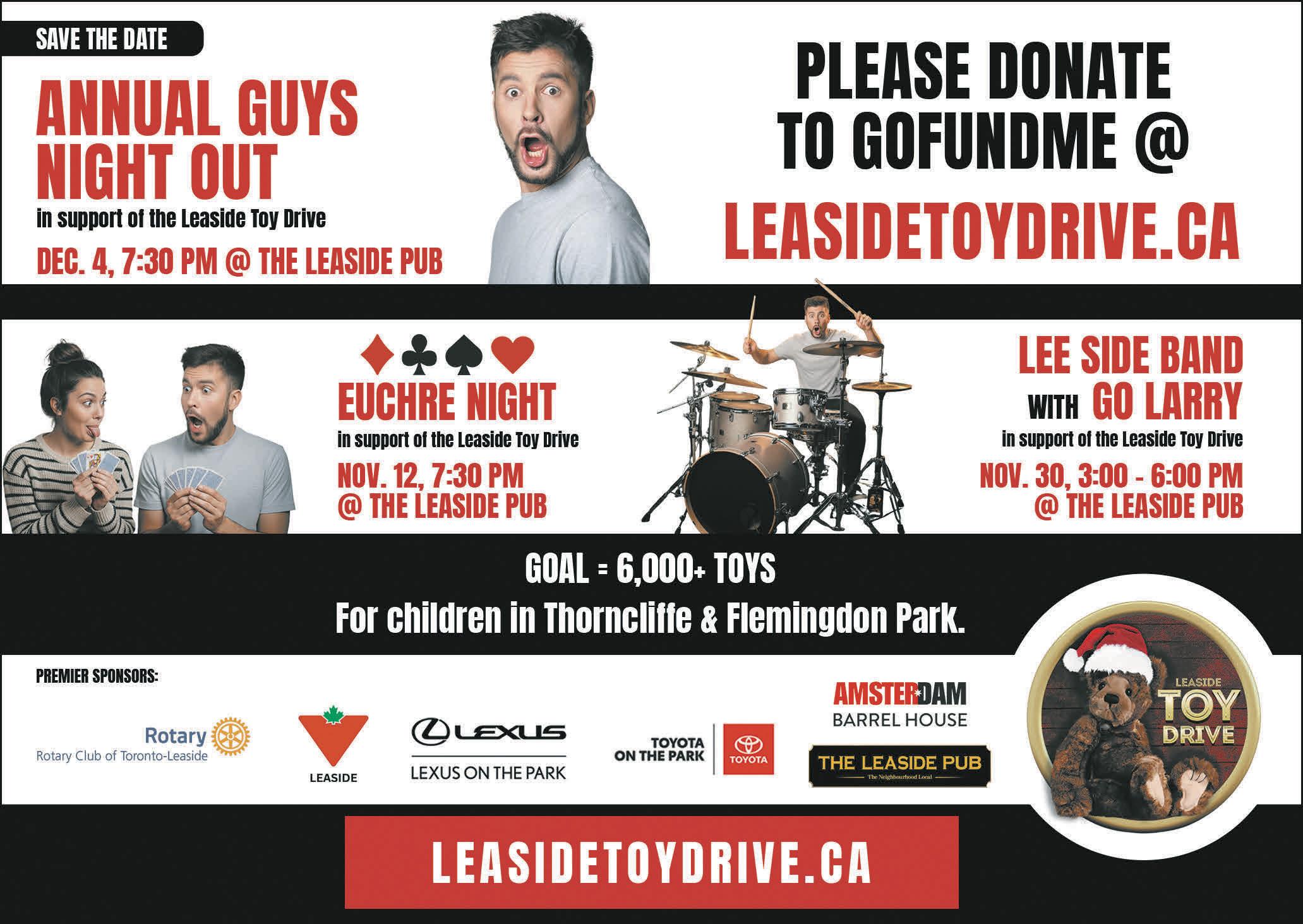 I'M PROUD TO SUPPORT THIS CHARITABLE LEASIDE TRADITION! PLEASE BRING UNWRAPPED NEW TOYS FOR DONATION TO BOSLEY REAL ESTATE AT 103 VANDERHOOF AVE. OR CANADIAN TIRE AT LAIRD/EGLINTON OR AMSTERDAM BARREL HOUSE LEASIDE VILLAGE 15TH NOV - 15TH DEC, 2025