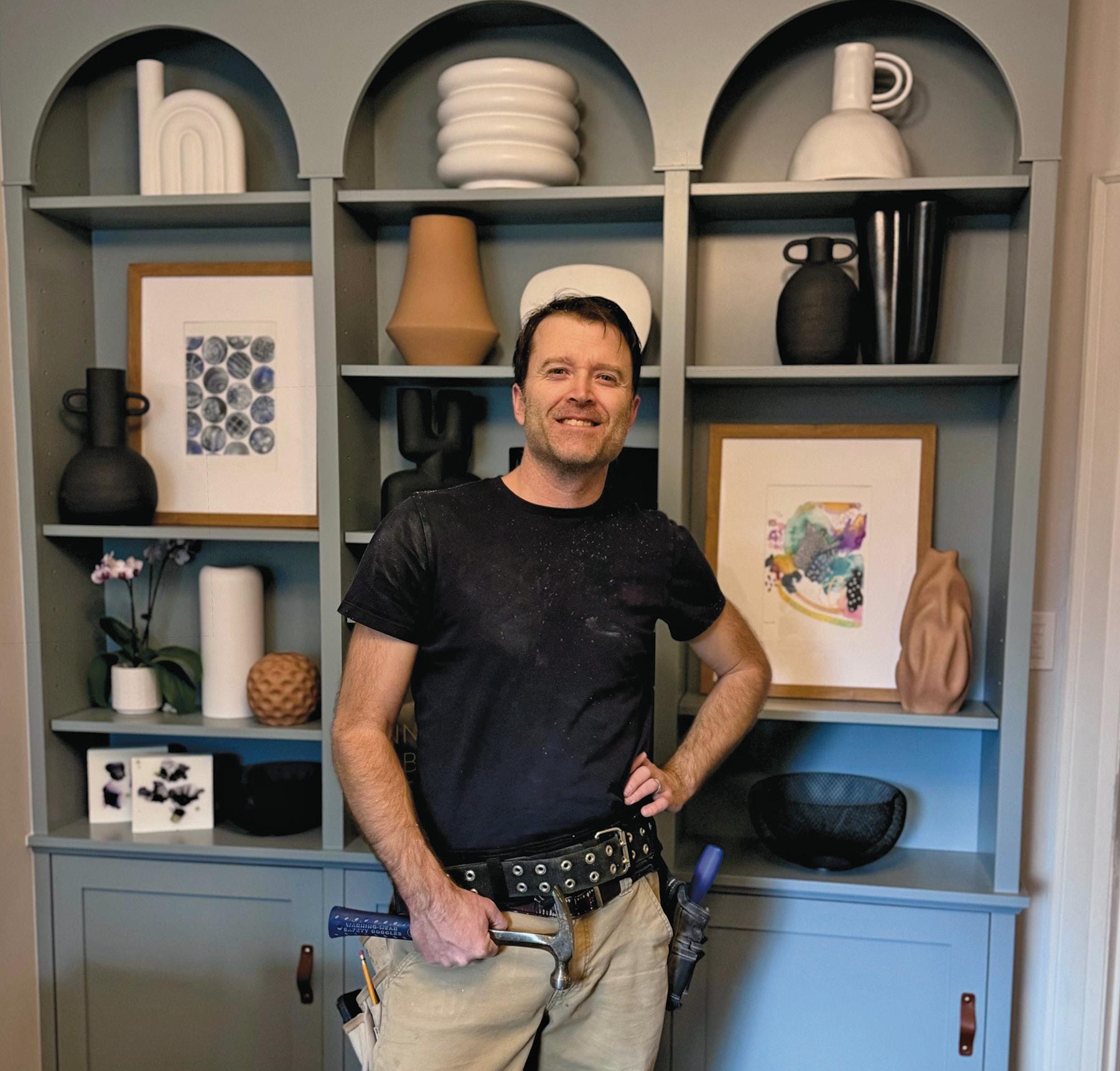 often brings in electrical, plumbing and upholstery specialists as needed. Matt enjoys all his assignments, but a recent favourite was a mudroom that included a walnut bench, walnut chevron panelling and navy-blue cabinetry. He says that challenging jobs are his “bread and butter” and cites an example where he created a set of display shelves for a collection of antique boxes mounted in the peaked wall of a cathedral ceiling. While other companies declined the project, Matt created an “enormous wall of shelves in the triangular section of the wall, which wrapped around a window, incorporated lights and included a rolling library ladder for access to the shelves.” It was “a super cool project,” he said.