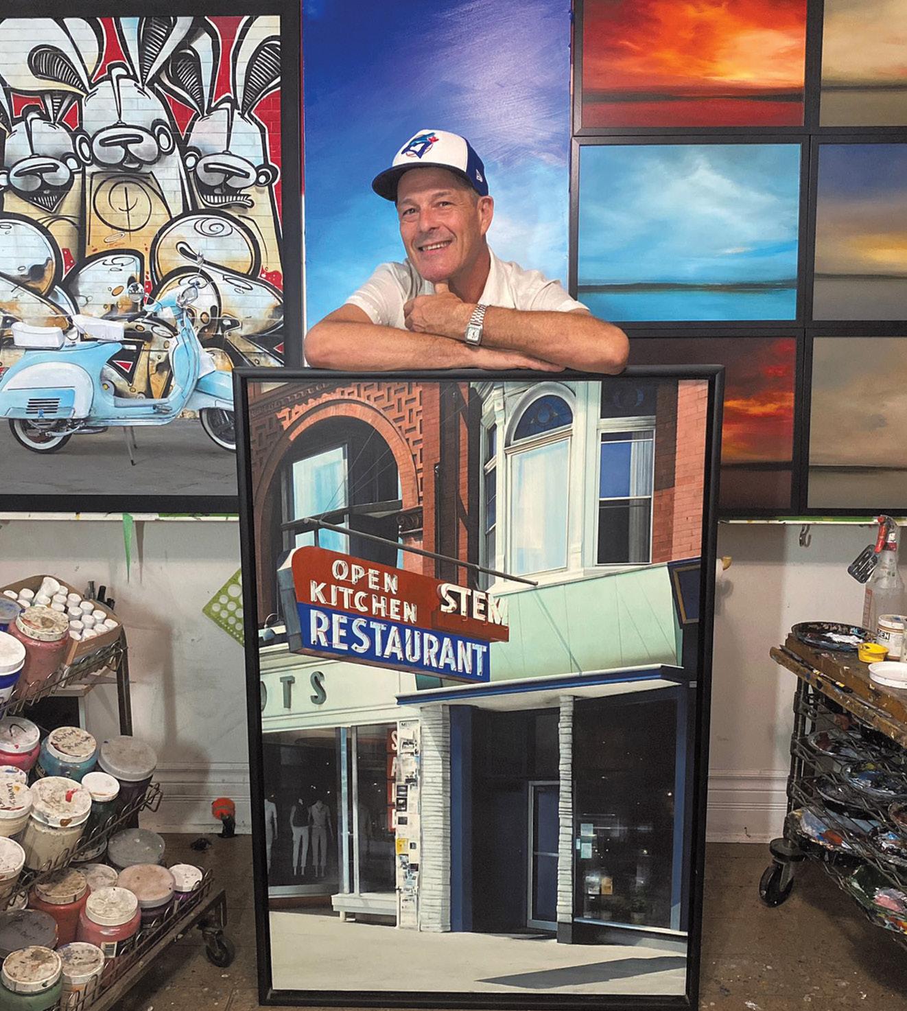 Now he has a home studio in the Annex “with a beautiful view of the backyard.” He doesn’t rely on natural lighting as he “works all hours of the day and night.” His style is realism, with influences from Edward Hopper, Alex Colville and Mary Pratt, among many others. Several of his paintings, he says, are “structures that remind me of my youth and remind me of simpler times.” Other paintings, of sunsets, for example, are done with “no direction. I work on them until I feel they give some kind of emotion, lighting effect or simply look pretty.”