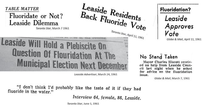 government to pass legislation empowering Toronto Council to mandate fluoridation. After several years of delay, the province passed leg islation in early 1961 giving Metro’s 13 municipalities – including Leaside – the option to: (1) enact fluorida tion; (2) hold a referendum on the issue; or (3) launch a petition to force a referendum. By now, Leaside had a new mayor, Charles Hiscott. He, too, opposed fluoridation, but was not supported by Leaside Municipal Council, which was split on the issue. Anti-fluoride Leasiders took matters into their own hands and organized a referendum-petition of their own. In just one night – on April 10, 1961 –canvassers visited households across the community and obtained more than 1,170 of the 1,248 required sig natures. The rest were obtained soon thereafter, for a total of over 1,800 sig natures. Other municipalities had sim ilarly successful campaigns. Since only 10 per cent of eligible voters needed to be signed, a plebiscite was assured.