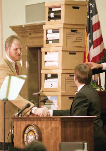 Jackie and I entered the building at the west doors. The rotunda was filled with row upon row of chairs; staging had been erected on the midpoint landing of the east rotunda steps that led to the Supreme Court. People had begun to arrive, and their early-bird status was rewarded by the Jay Welch Chorale and 23rd Army Band, both finishing brief rehearsals. Television camera crews were testing the equipment that would broadcast the ceremonies simultaneously on the state’s television and radio stations. Arrangements had been made for our children to be transported separately so they wouldn’t have to wait—a practical concern for Jackie, who knew the difficulty of containing five children ranging from two-and-a-half years old to sixteen. We were ushered to a committee room within the legislative wing to greet other podium guests and wait for events to start.