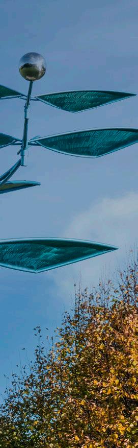 Skywriting I, with its graceful movement during a gentle breeze, is the first kinetic artwork in Leawood’s Public Art Collection. The piece is painted a shimmering iridescent blue—reflecting the sky as it moves with the wind. John King’s inspiration for the piece came from a hang gliding experience when he was joined in the air by a hawk. “We flew and circled together for several minutes, each eyeing the other from above or below as the air changed. This piece represents several birds seen overhead like this, circling and crossing each other’s paths, and the resulting choreography of their wings against the sky.”