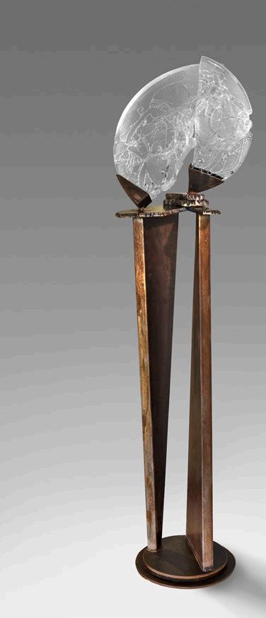 John Northington sculpts using commonplace materials such as concrete, steel, and glass. By molding, forming, and then partially destroying these materials, he gives his sculptures an eclectic and industrial look. His work evokes elements of nature and archaeology, using recycled materials to create what he feels are “fossils of used cities.” X is constructed of crisscrossing cast glass, with a torch cut steel base. It stands gracefully on a wedge-shaped pedestal.