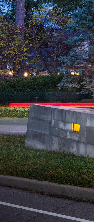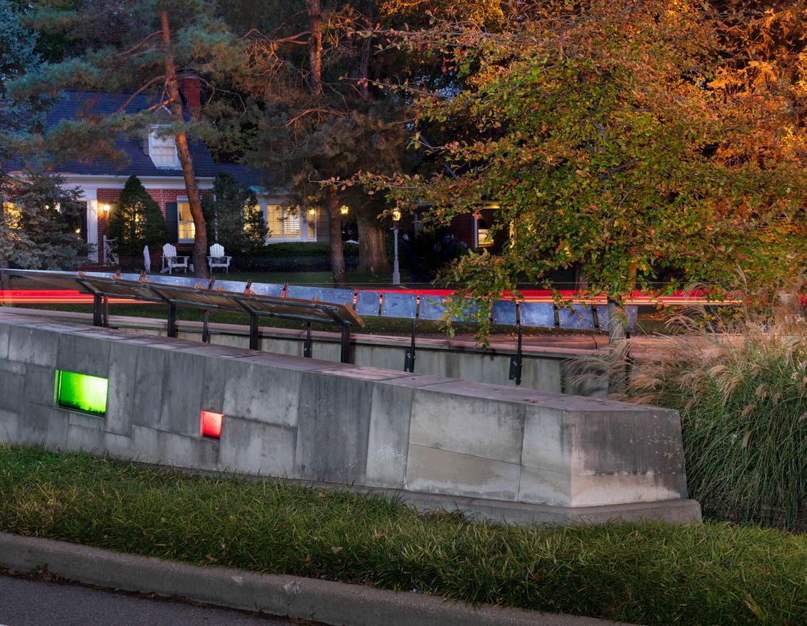 constructed Porch Lights from saw-cut Cottonwood Falls Kansas Limestone and backlit molten colored glass. This landscape artwork sits within the traffic Island at the intersection of Somerset and Lee Boulevard on land shared by the cities of Prairie Village and Leawood. It was commissioned as a “coming home” gesture at the gateway to the Historic District of Leawood, which was developed at the end of World War II. During World War II, Americans upheld a tradition of keeping their porch lights on in order to help “our boys” overseas find their way home. The glowing colored glass scattered throughout the triangular stone structure represents this welcoming home of porch lights. In addition, the V shape of the design is reminiscent of the “V” for victory, made famous by Winston Churchill during the same time period.