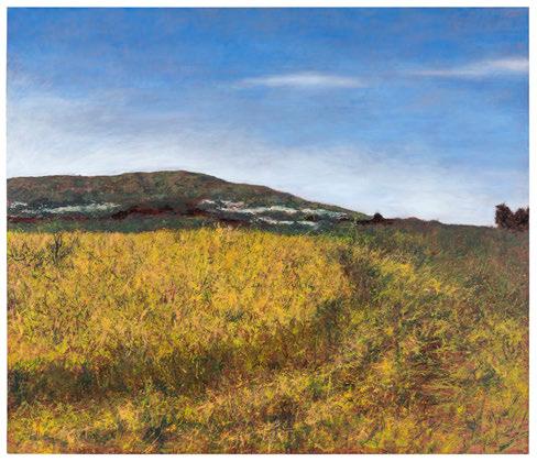 The large 4.5’ x 4’ landscape depicts a rural scene in Israel. The peaceful terrain features the sweeping curve of a subtle pathway vanishing into the horizon. A Kansas viewer might be reminded of wagon tracks in the Flint Hills.