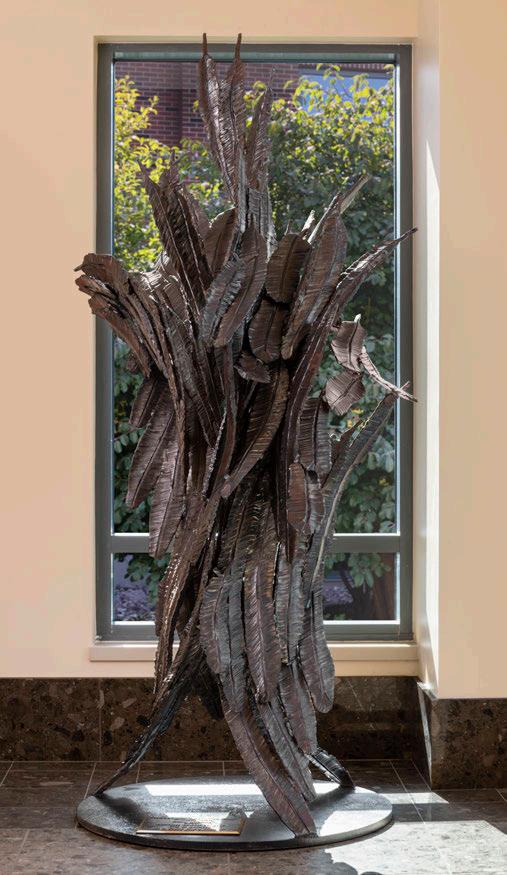 The steel feathers, cut by flames, are reminiscent of anagennisi or rebirth, like that of the phoenix—a bird that casts itself into flames to be reborn from its own ashes. During the work’s inception, Hoffman cut 150 feathers but used only 110 in the fabrication. The remaining feathers were given away in an act of communion or koinonia, to people in the Kansas City community with whom he felt an important connection.