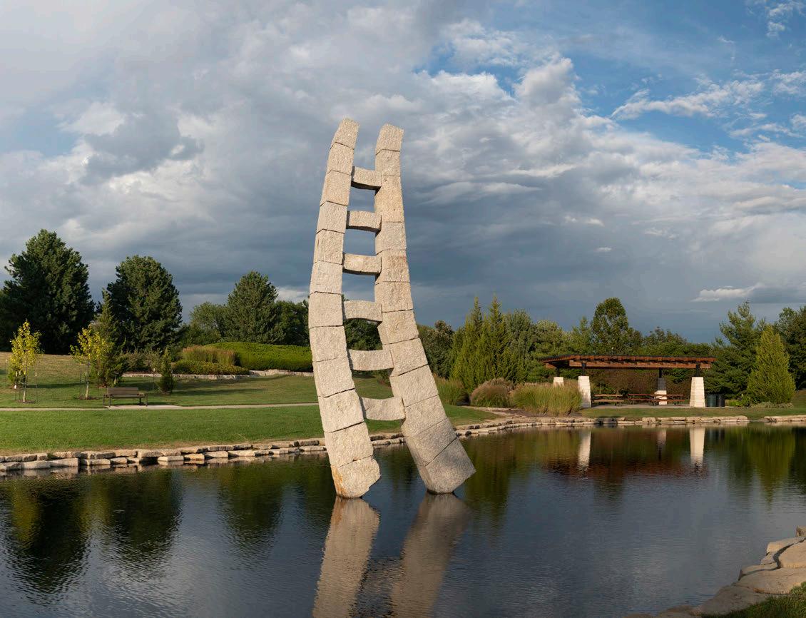 The 22’ ladder of steel and recycled granite rises from a small reflecting lake. Averbuch states, “The ladder grows out of its reflection created in the water. Stone and water are opposites and are the materials from which I carve this image. They form a dialogue with surprises and questions.” The symbolism of a ladder, along with that of water, allows the viewer to consider the connections between the physical and the metaphysical.