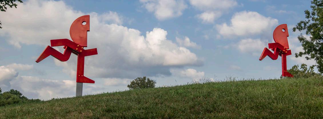 These brightly painted sculptures by Jorge Blanco celebrate the athletic endeavors that take place throughout Leawood City Park. The abstracted figures of For the Goal and Run Red Run depict a moment of action frozen in time. Blanco’s careful consideration of the site, as well as playful use of scale and punchy primary colors, fulfill his artistic vision to create relatable and joyful works of art. The influence of his formal education in industrial design is most noticeable in his use of heavy-duty industrial hardware. Always one for creative play, Blanco is also a recognized cartoonist, illustrator, and furniture designer with interests in science, music, sports, and humor.