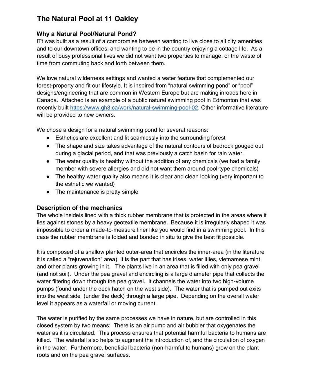 As well as plant based dyes to darken the water which acts as a sunscreen for your natural pool. These dyes are natural plant based not harmful to the environment and will not dye clothing or your skin. Unlike a traditional pools, you don't cover, drain or refill the pool in different seasons. In cold climates, natural pools can be used in the winter as ice rinks (if frozen solidly). Because natural pools are filtered and cleaned by water in motion, and plant life, they deter pests Frogs and wildlife may be attracted to a natural pool, but typically won't stay long, as there will be no reliable source of food for them in the pool. In natural pools, many types of plants can be used to provide oxygen and aid in water filtration. Plants can be classified into three categories within the natural pool environment: emergent, deep water- rooted and floating plants.