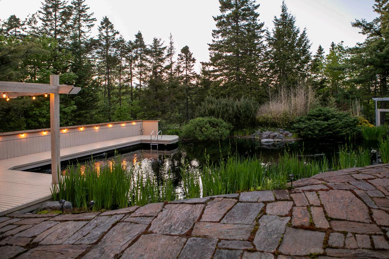 Natural swimming pools have been established in Europe for decades, and they continue to gain awareness in North America as their style and eco-forward function is embraced by more pool designers, builders, and homeowners, it brings a more natural swimming experience. Natural pools require no chemicals to maintain – instead, natural pools benefit from perennial plants and water flora, which help keep the water clean by creating a wetland ecosystem which fits more harmoniously into the environment. Natural pools rely on moving water which adds oxygen into the water, plants to clean and filter the water plus by adding beneficial plant bacteria the water is crystal clear
