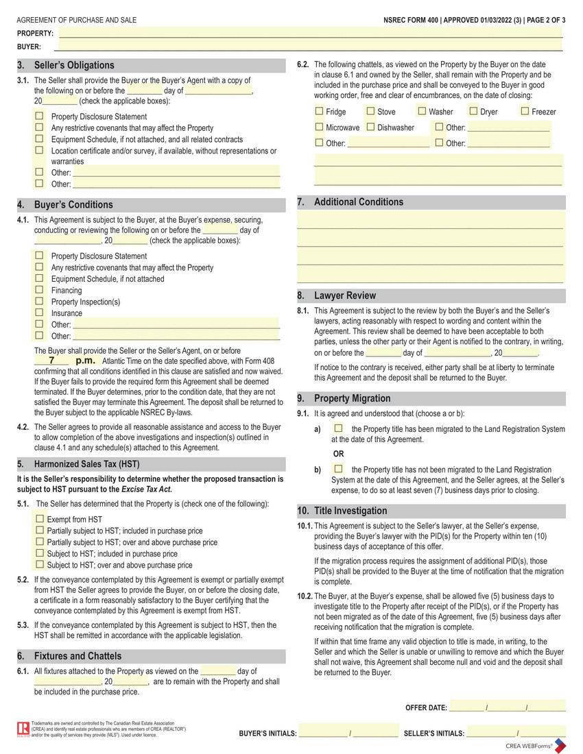 This is a standard purchase and sale agreement which outlines the terms of the offer and covers the most common conditions buyers would like satisfied when purchasing a property.