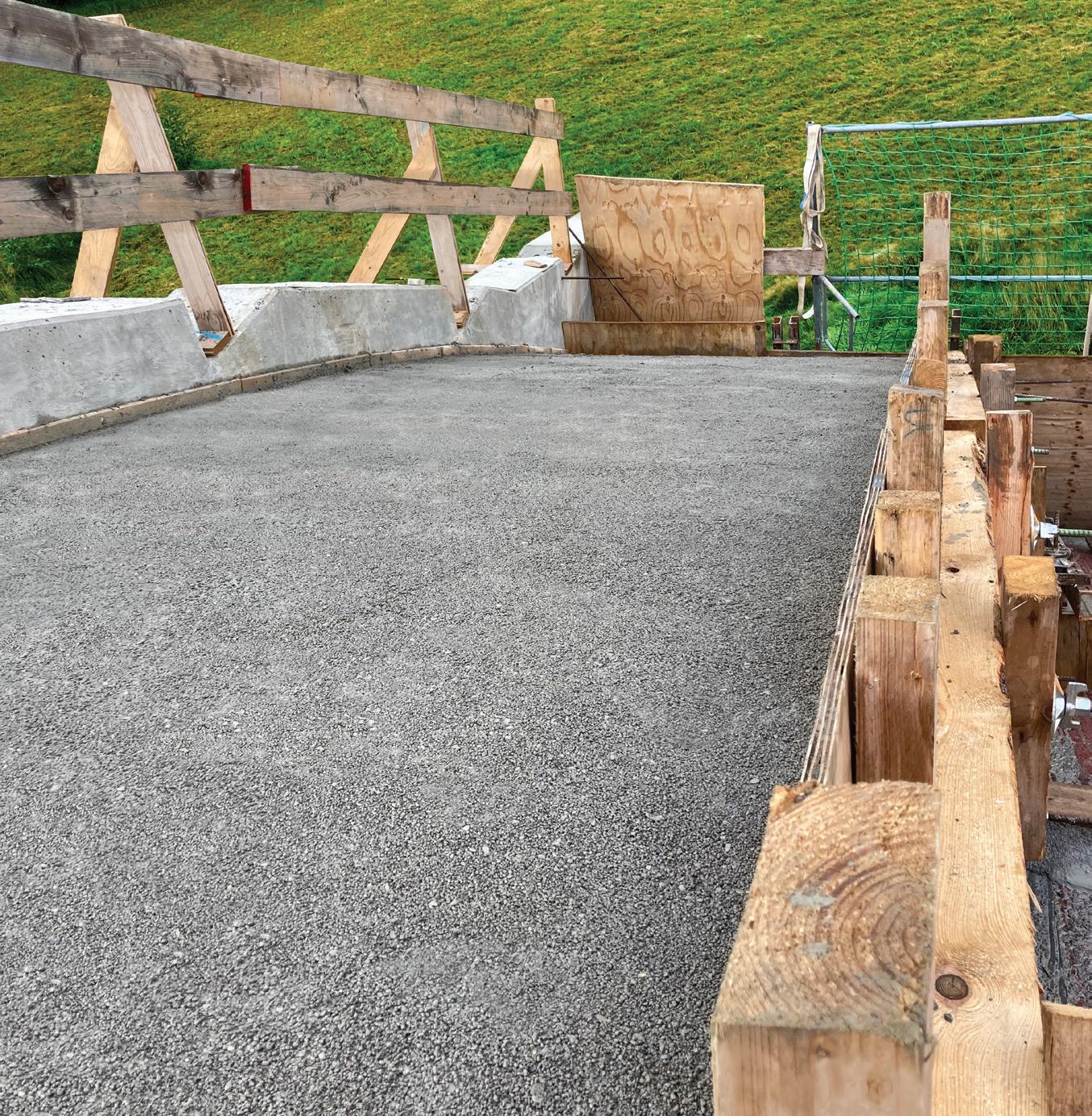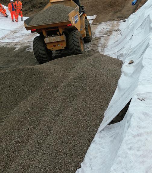 der die Last im Vergleich zu einer herkömmlichen Schüttung bis auf ein Fünftel reduziert werden kann. Darüber hinaus verfügt er über ein ausreichendes Haftvermögen und einen hohen Reibungswinkel, um bei der Verbindung mit Metall- oder Ge ogittern gut zu funktionieren. Für das Projekt wurden insgesamt ca. 2.600 m3 Arlita LWA 10/20 benötigt, das eine Schüttdichte von 275 kg/m3 und eine berechnete Dichte von 400 kg/ m3 unter Aufschüttungs-bedingun gen aufweist.