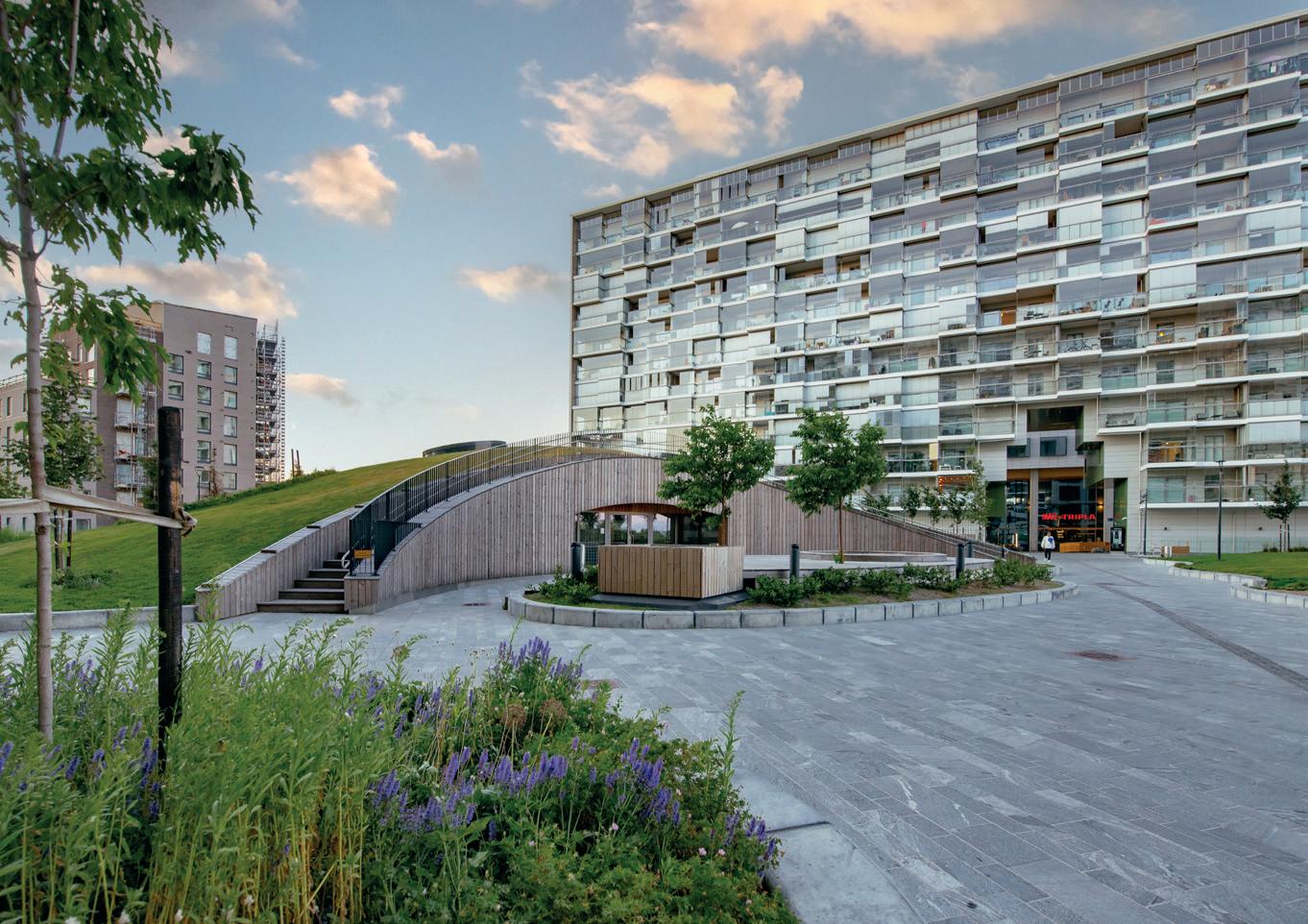 Das Gründach des größten Einkaufsz entrums in Skandinavien dient auch als Erholungsbereich für die angren zenden Wohnhäuser. Entwurf und Bau von Gründächern erfordern einerseits Verständnis für die Statik, andererseits aber auch Kenntnisse über das Wasserman agement der verschiedenen Pflan zenschichten und ihre Anpassungs fähigkeit an wechselnde Wetter- und