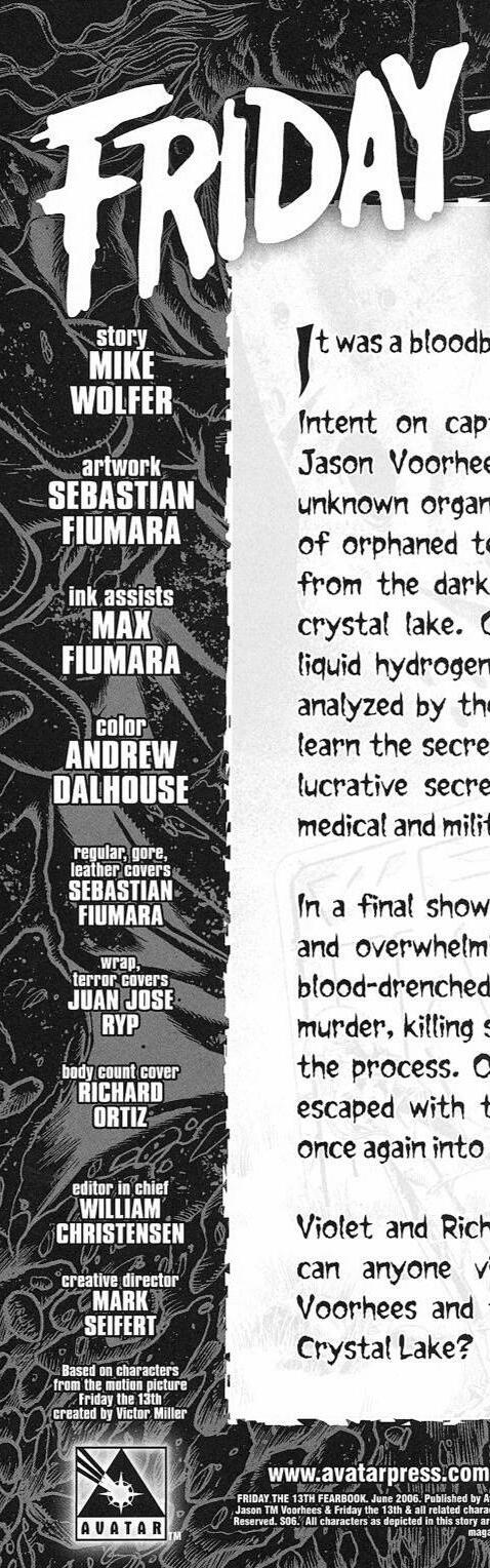 Friday the 13th Fearbook es un cómic de 2006 escrito por Mike Wolfer, ilustrado por Sebastian Fiumara y publicado por Avatar Press, que también hizo Pesadilla en Elm Street y La matanza de Texas.