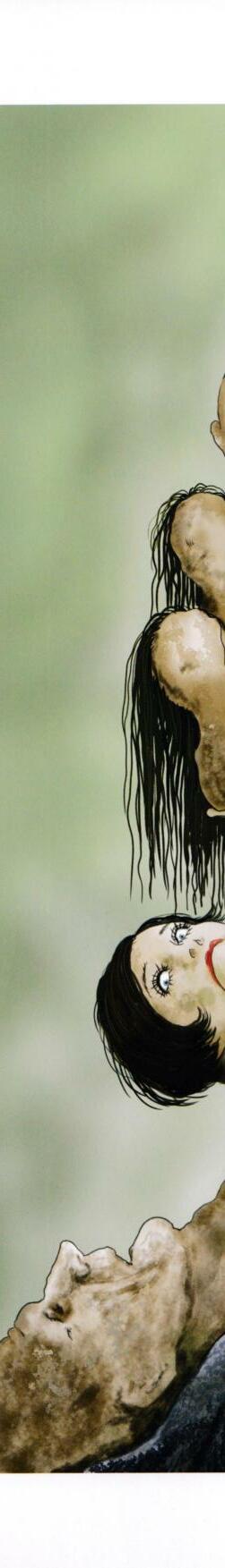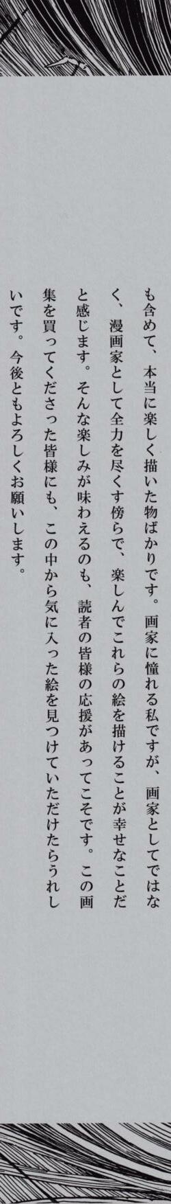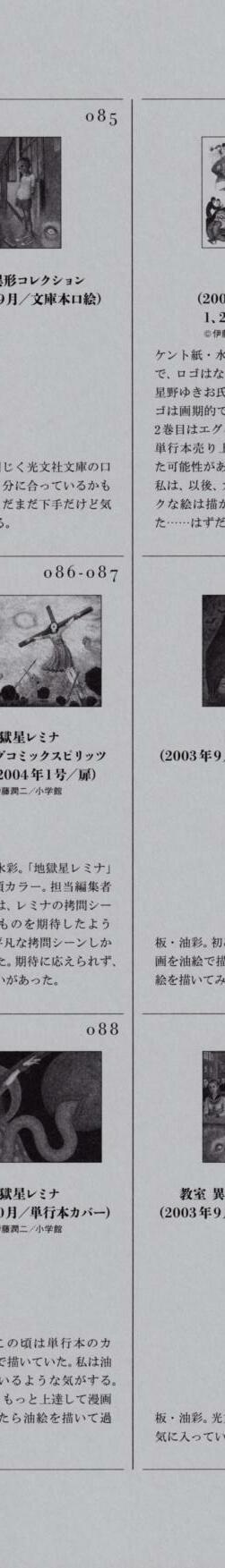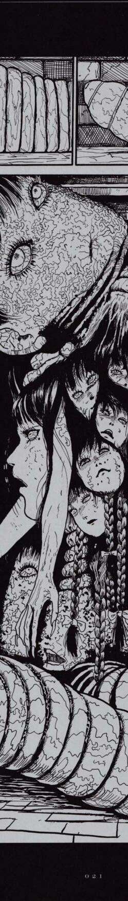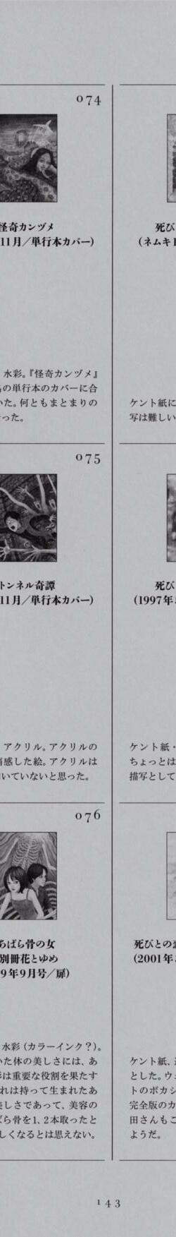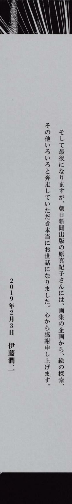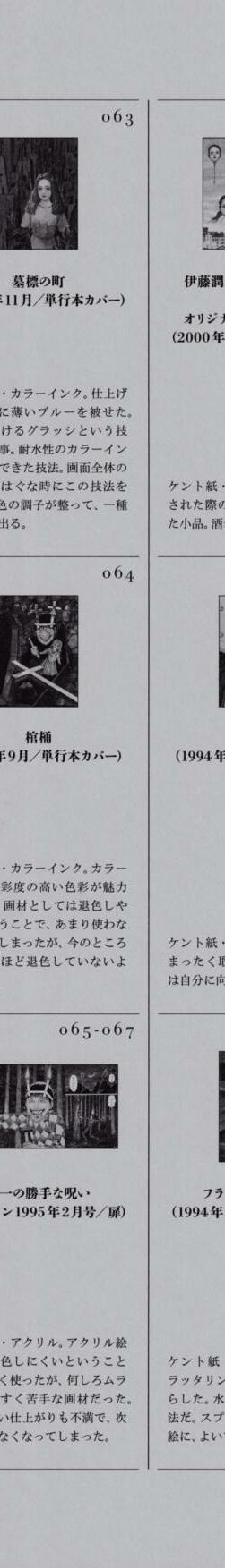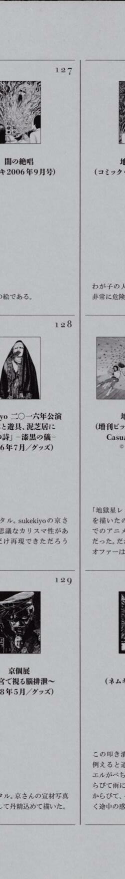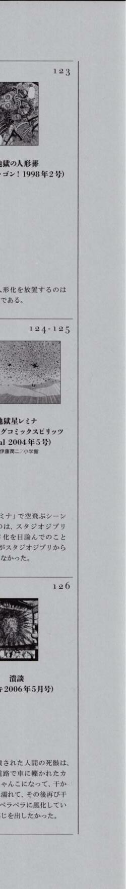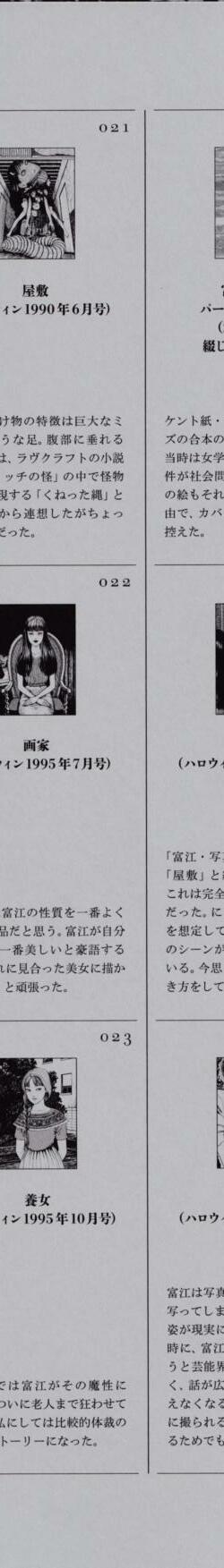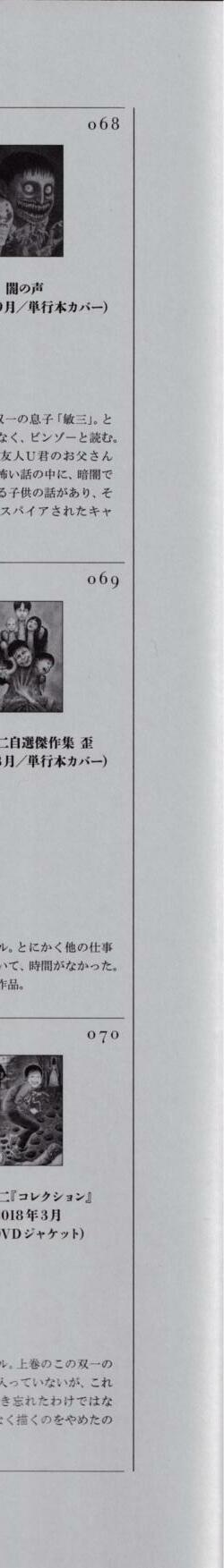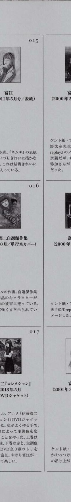 Incluye imágenes de sus obras más representativas como "Tomie" "Uzumaki" "Las caprichosas maldiciones de Sôichi" "Muerto por amor" "Gyo", etc. hasta su última obra.