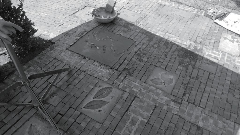 �.綠意&水泥壓花:最後綠意的植入,是與社區居民 合作的,而水泥壓花則是我們下的巧思,自己去尋 找適合壓花的材料,自己做實驗