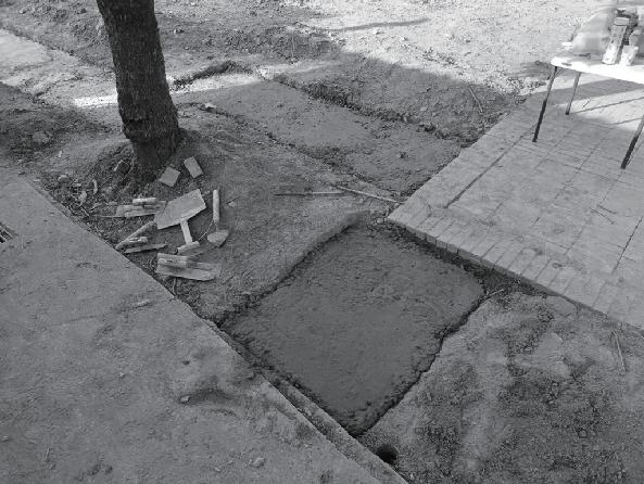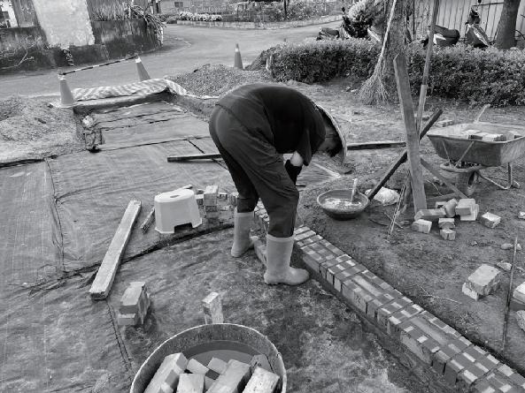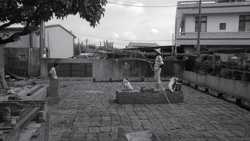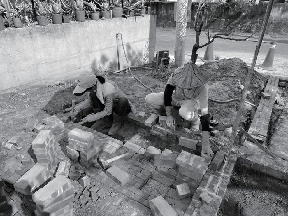 �.砌鋪面:我們在活磚底下鋪設抑草蓆,防止雜草 繼續生長,而鋪面則是利用活磚就增加整體基地的 透水性