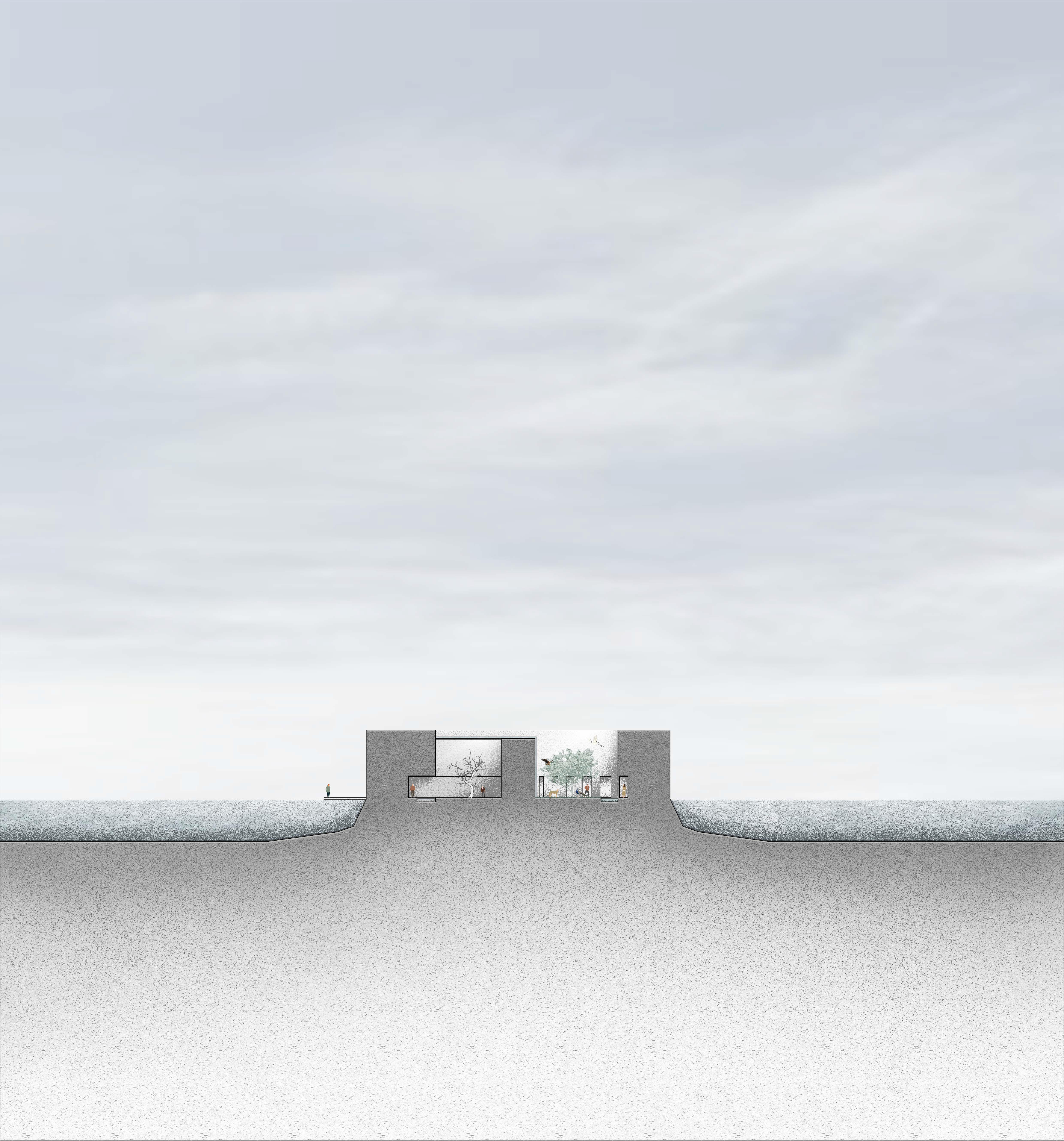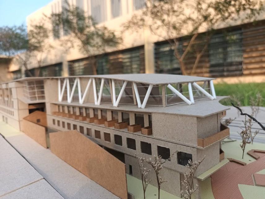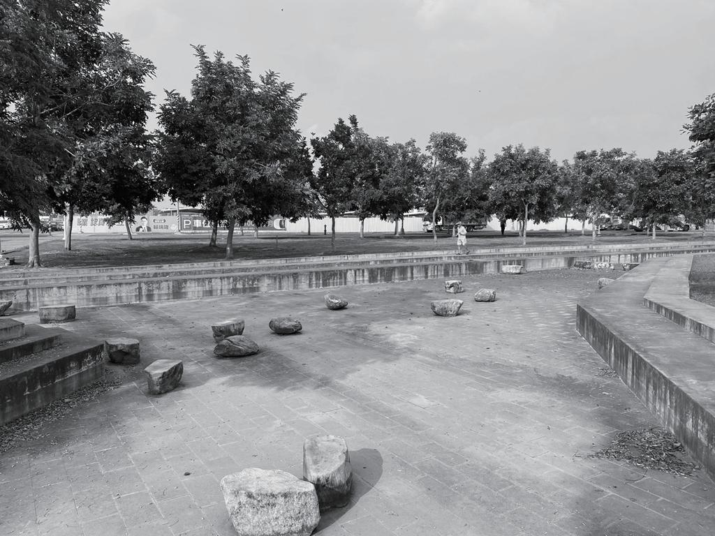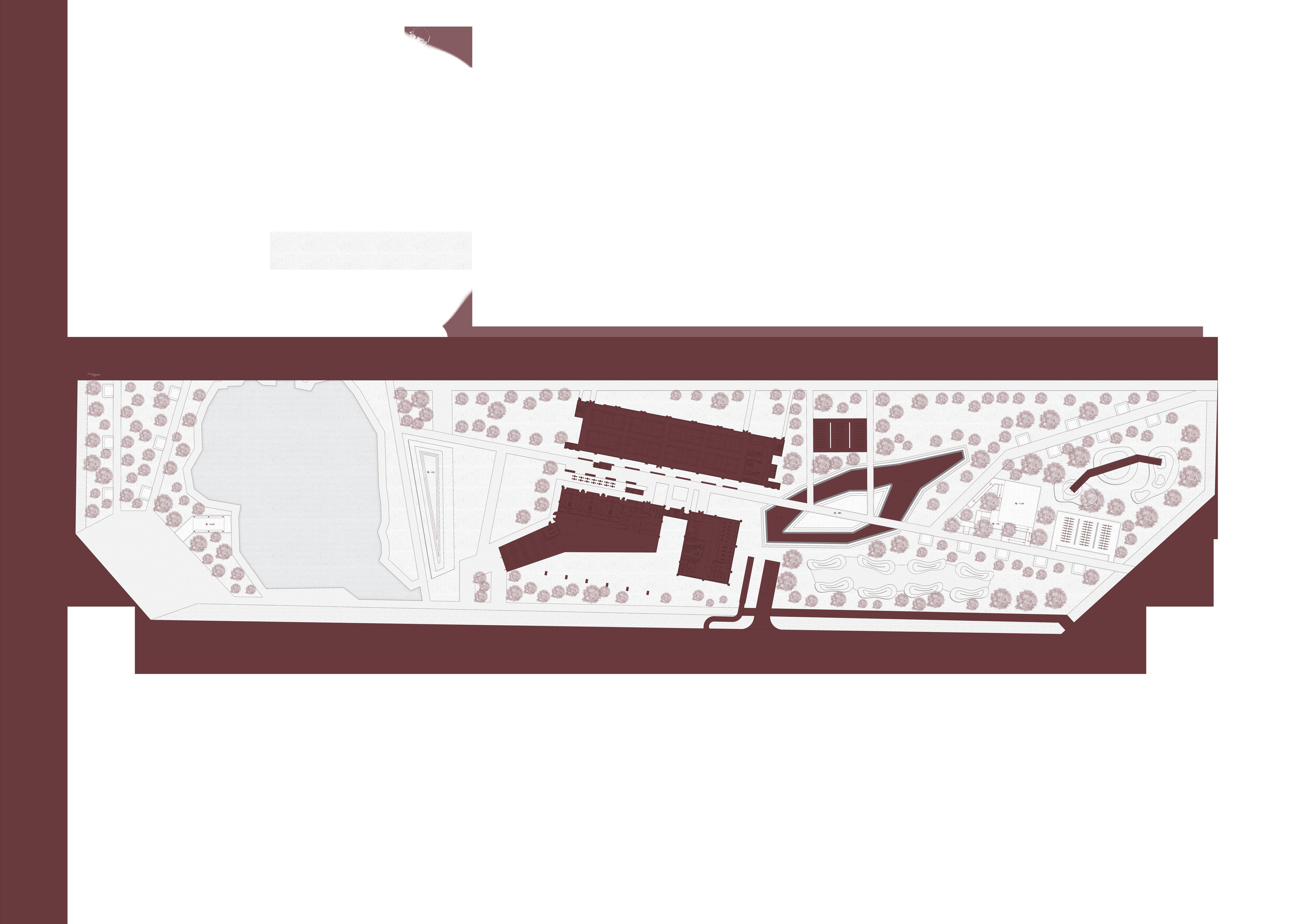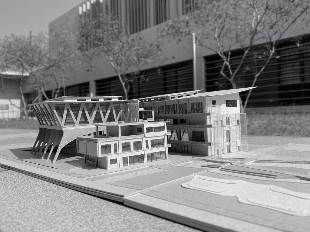 在設計前的操作盡量維持原有的敷地設計,做的不是 更動只是改良,為了讓周遭居民改變對於此建設的硬 性態度,主要先以配角的方式出現,用陳群的樹包圍著 每一個場域,試圖消弭身旁突然出現一個龐然大物的 異物感