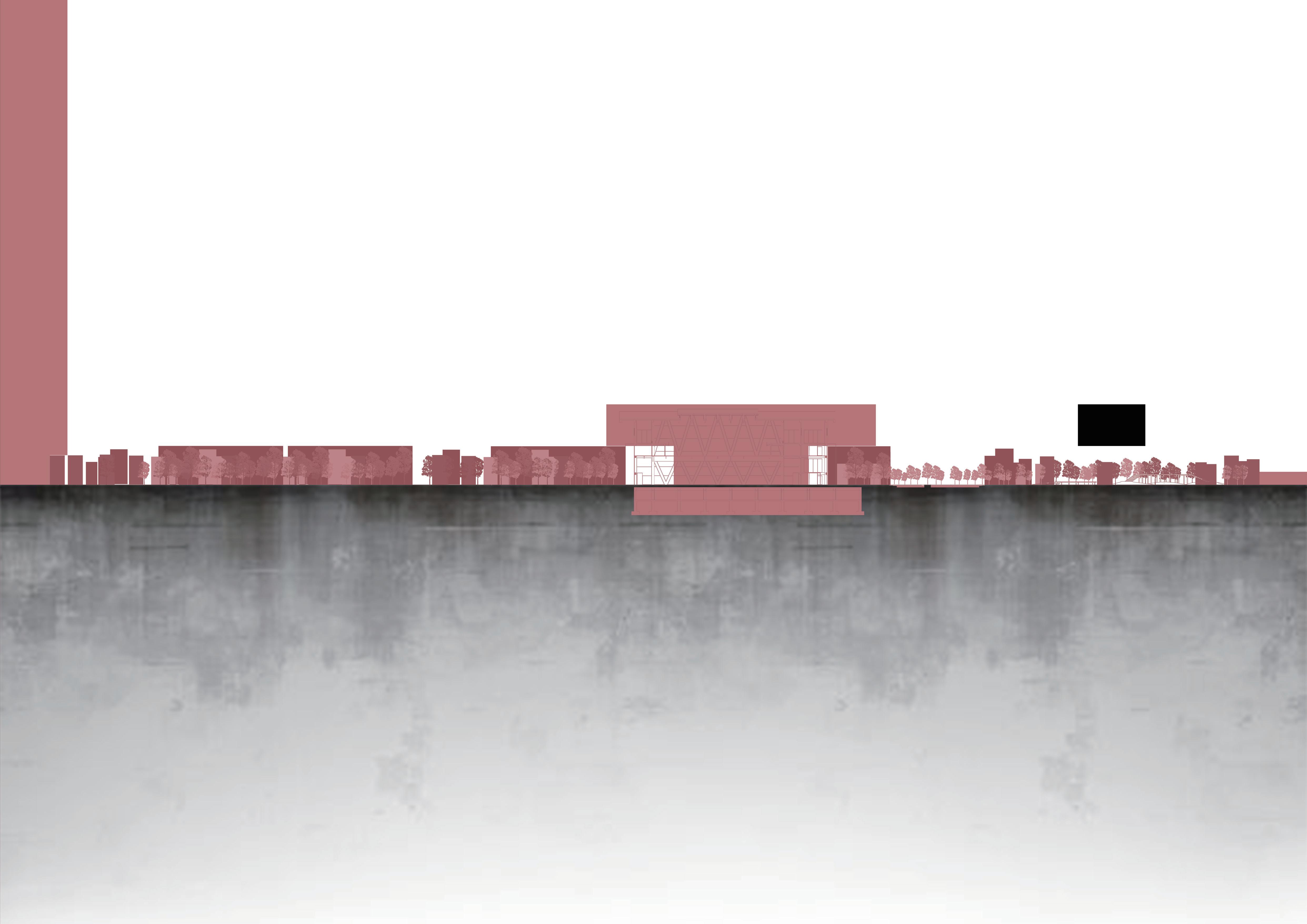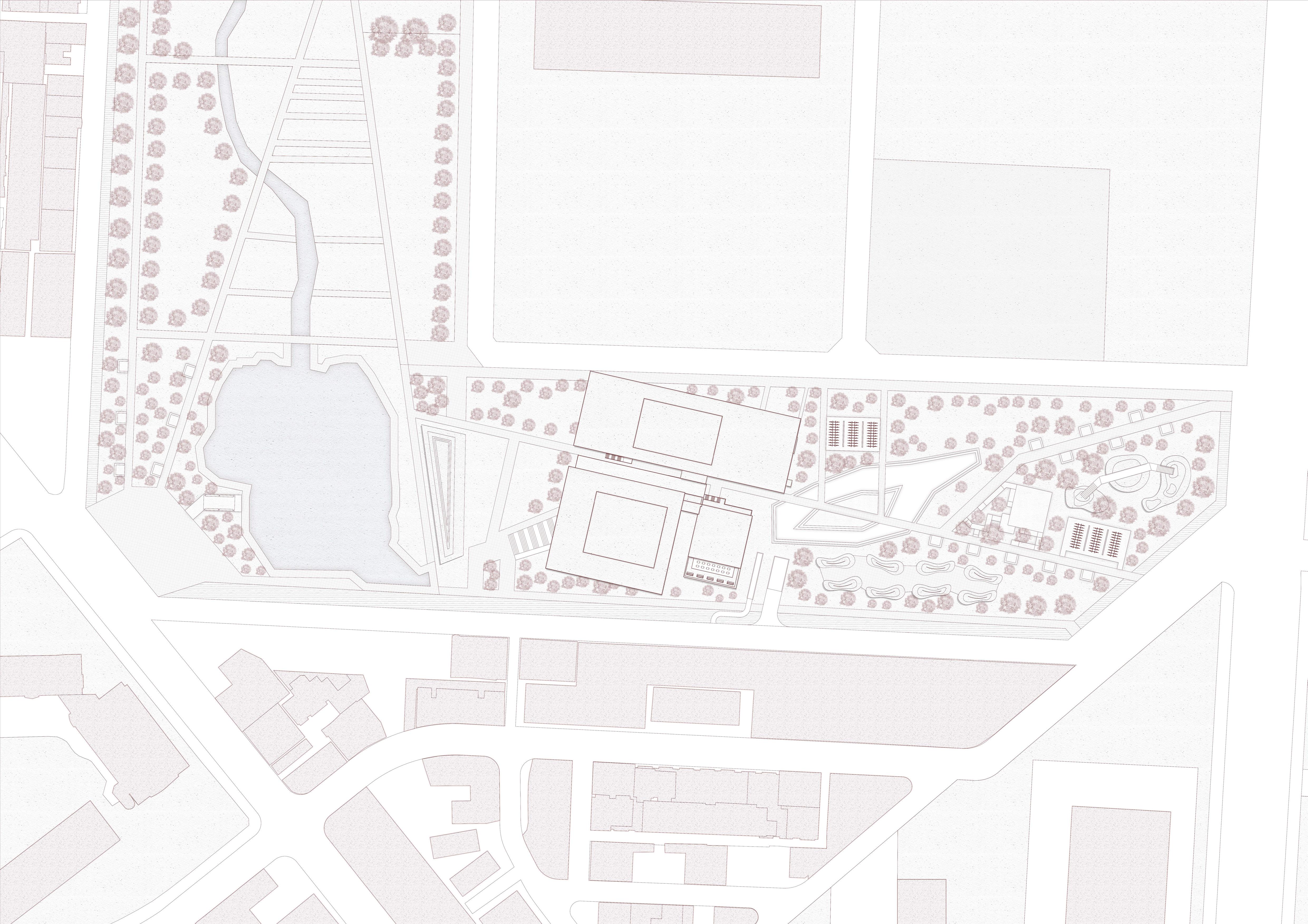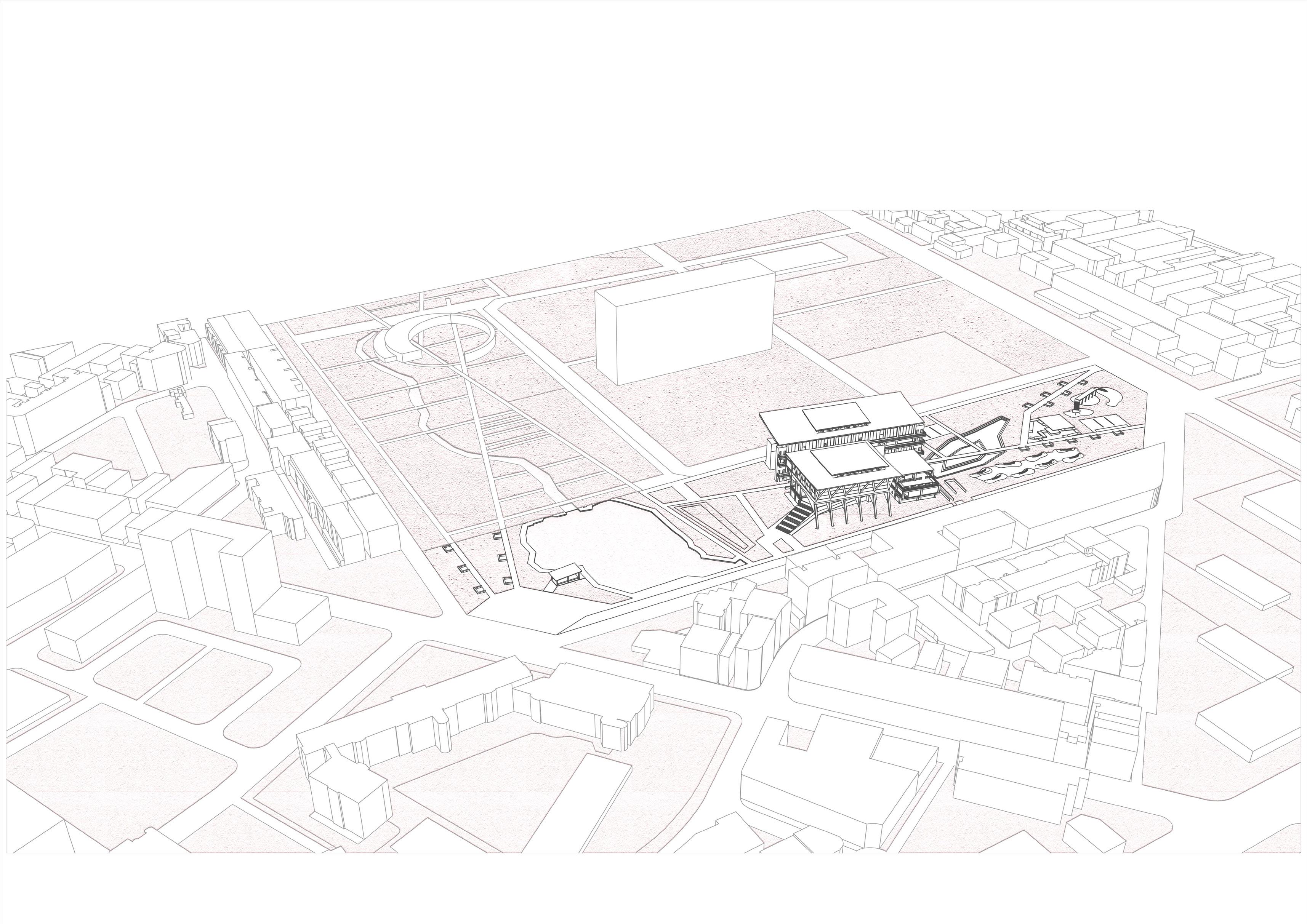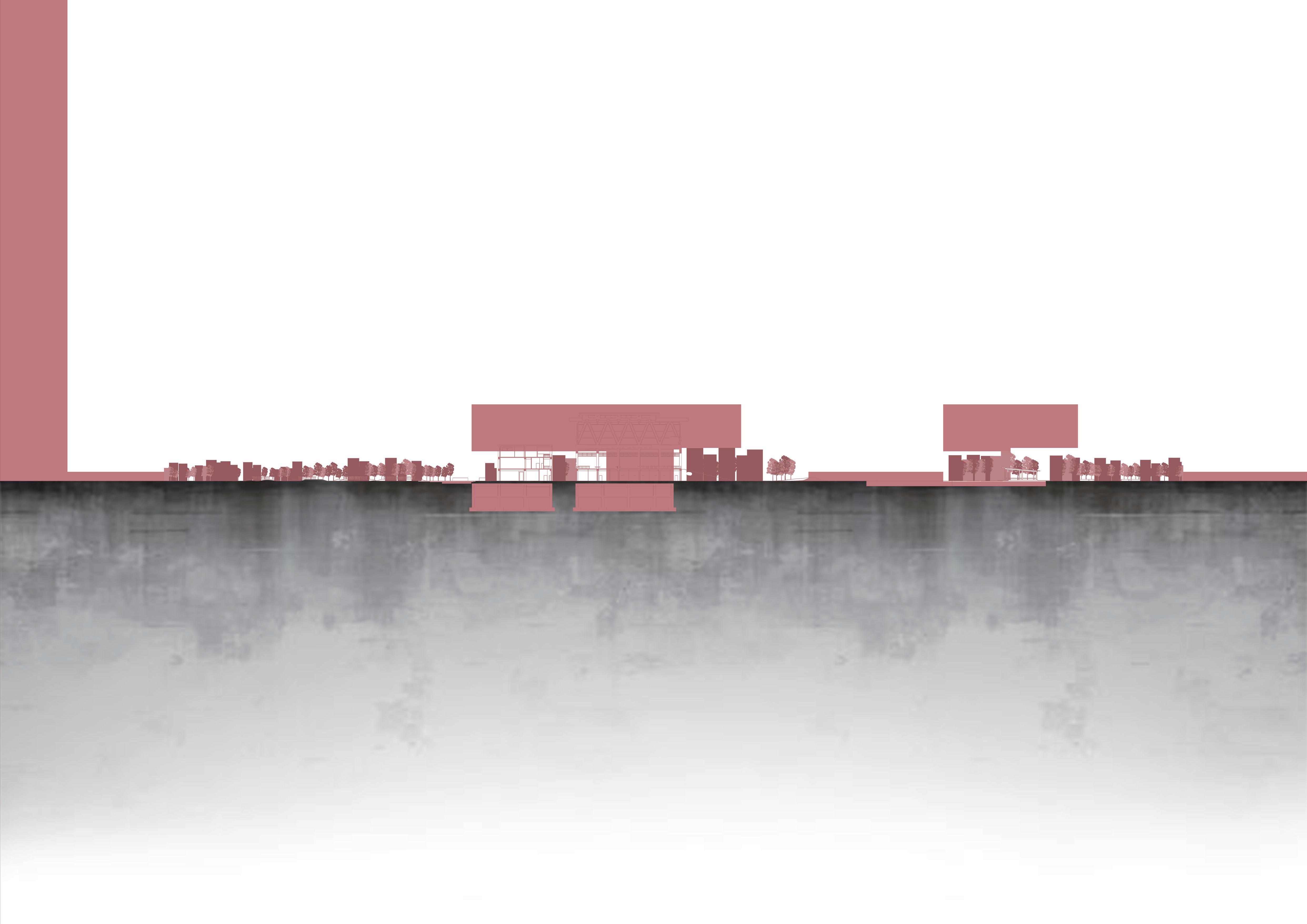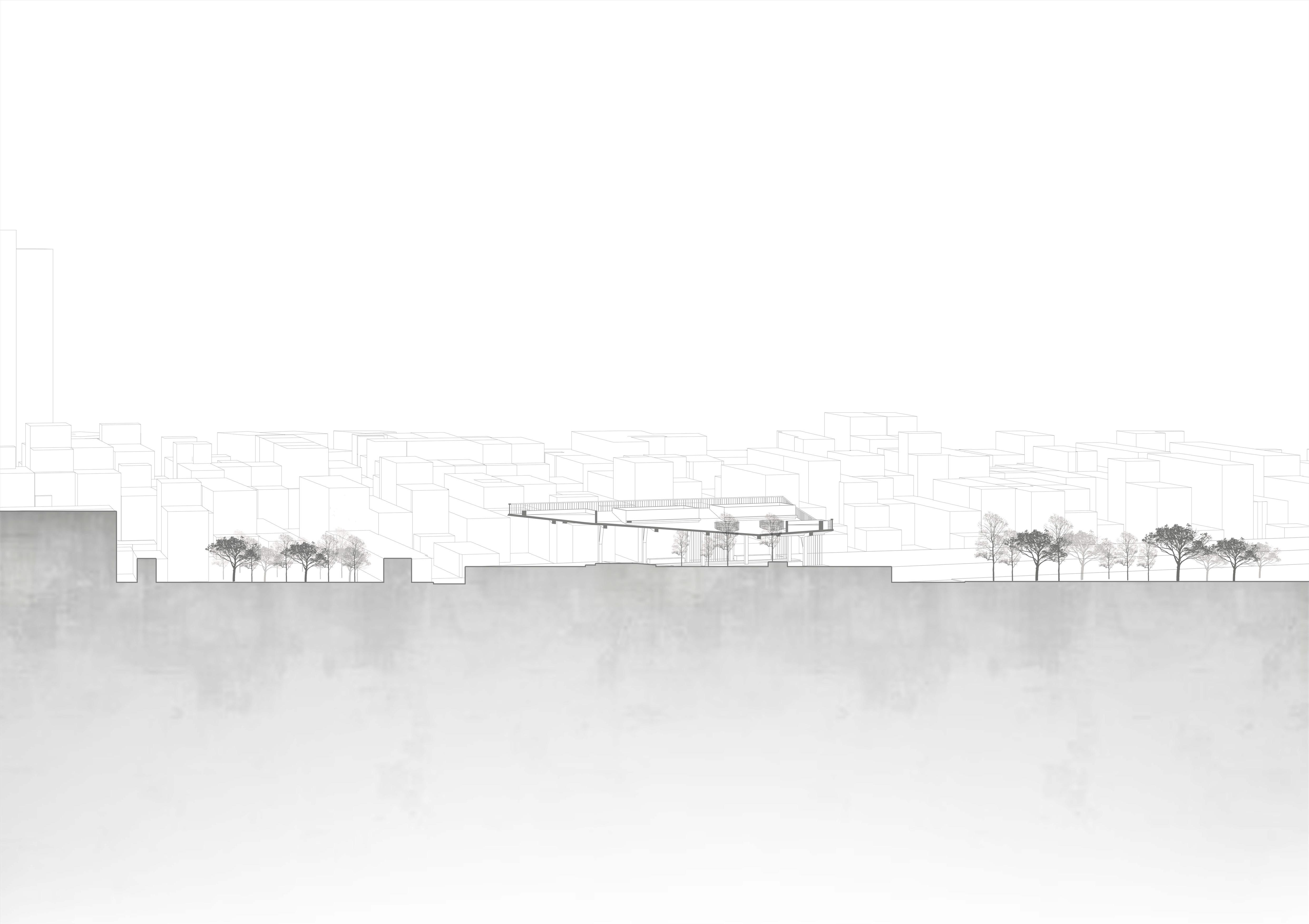 希望這個設計能跟當地結合,所以經歷了過去居民們對於 綠地的強烈反對,我的介入主要先找了一個立足點,消弭 未來基地北側的商業大樓所帶來的天際線變化,再來是讓 社區空間擠入運動中心,所以游泳池等相關機能才會被抬 升至高處,而建築計畫則是配合讓居民路過的使用方式