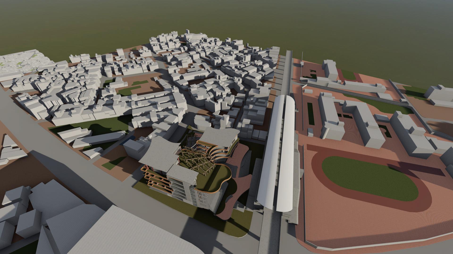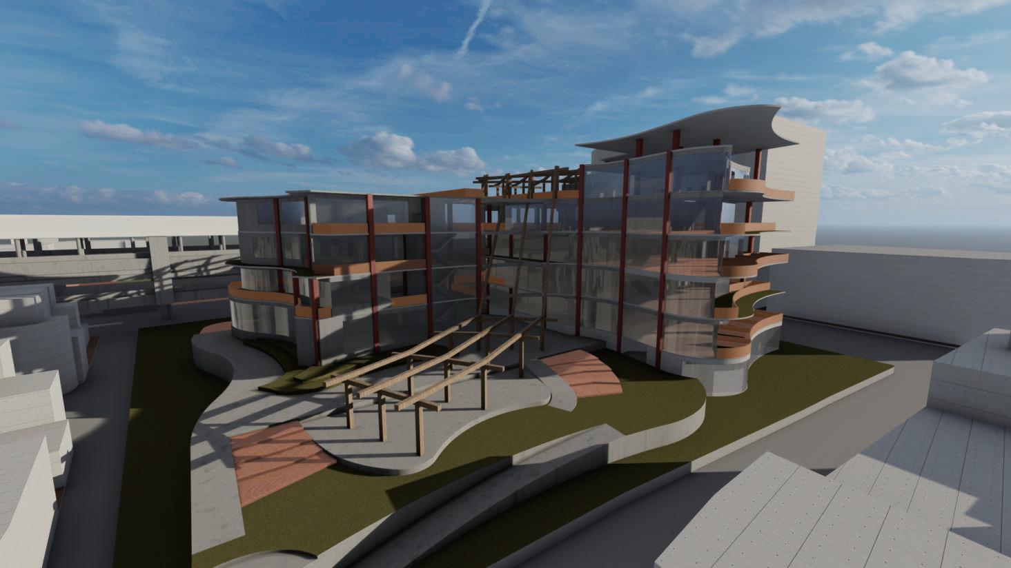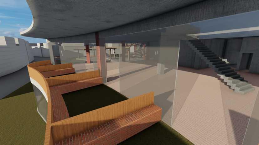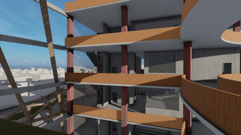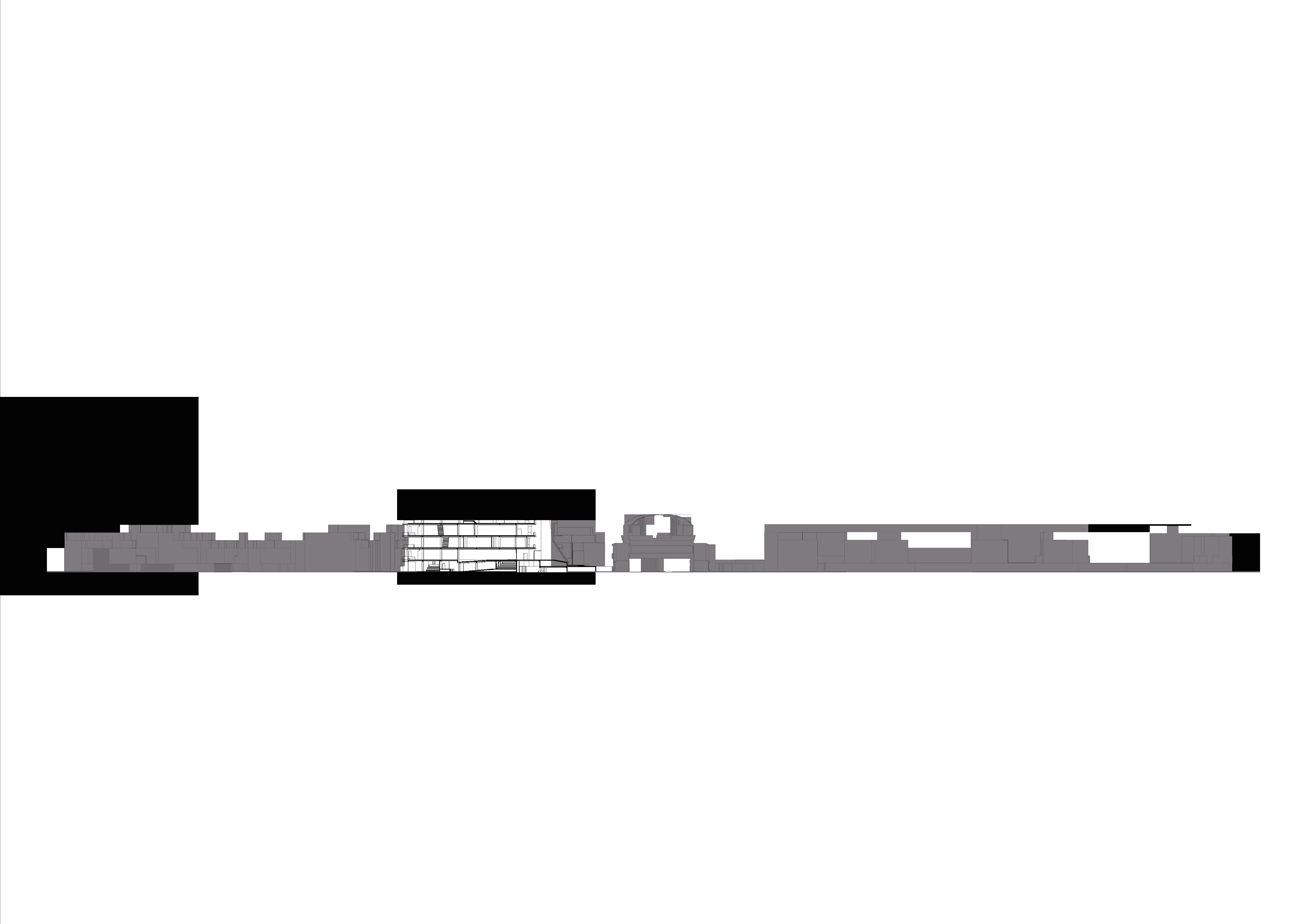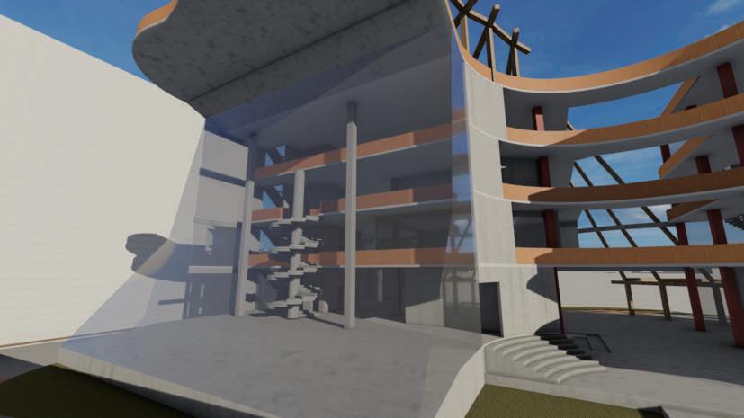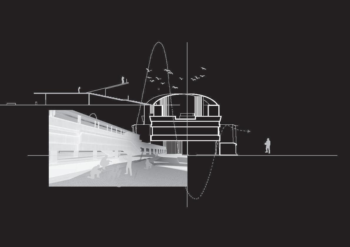 兩 量 體 的 連 結 性 除 在 中 央 挑 高 兩 側 進 行 許 多 退 讓