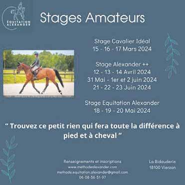 CSO : 29-31 mars : F LA FERTE ST AUBIN (45), Amat F VIERZON (18), Pro-Amat 5-7 avril : F LIGNIERES (18), Pro-Amat 11-14 avril : F CHARTRES (28), Pro-Amat 18-21 avril : F ISSOUDUN (36), Pro-Amat. Hunter : 6-7 avril : F VIERZON-ILE BRAGARD (18), Amat.
