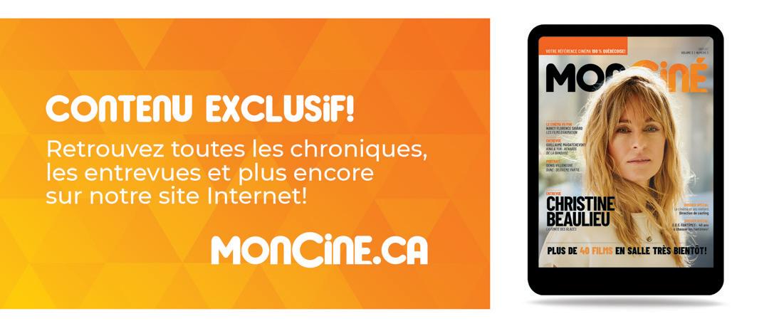 Le magazine MonCiné est publié tous les trois mois et est disponible en version papier dans plusieurs points de distribution, dont plus d’une trentaine de cinémas à travers le Québec. Vous pouvez consulter le magazine en version électronique ou vous abonner sur notre site Internet (moncine. ca) pour recevoir la version papier à la maison.