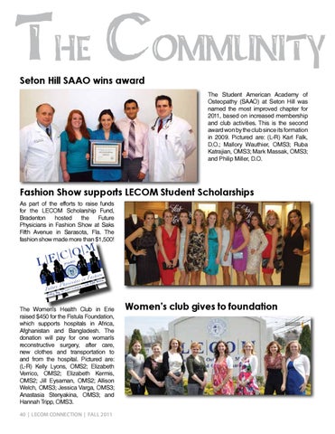 The Women’s Health Club in Erie raised $450 for the Fistula Foundation, which supports hospitals in Africa, Afghanistan and Bangladesh. The donation will pay for one woman’s reconstructive surgery, after care, new clothes and transportation to and from the hospital. Pictured are: (L-R) Kelly Lyons, OMS2; Elizabeth Verrico, OMS2; Elizabeth Kermis, OMS2; Jill Eysaman, OMS2; Allison Welch, OMS3; Jessica Varga, OMS3; Anastasia Stenyakina, OMS3; and Hannah Tripp, OMS3. 40 | LECOM CONNECTION | Fall 2011