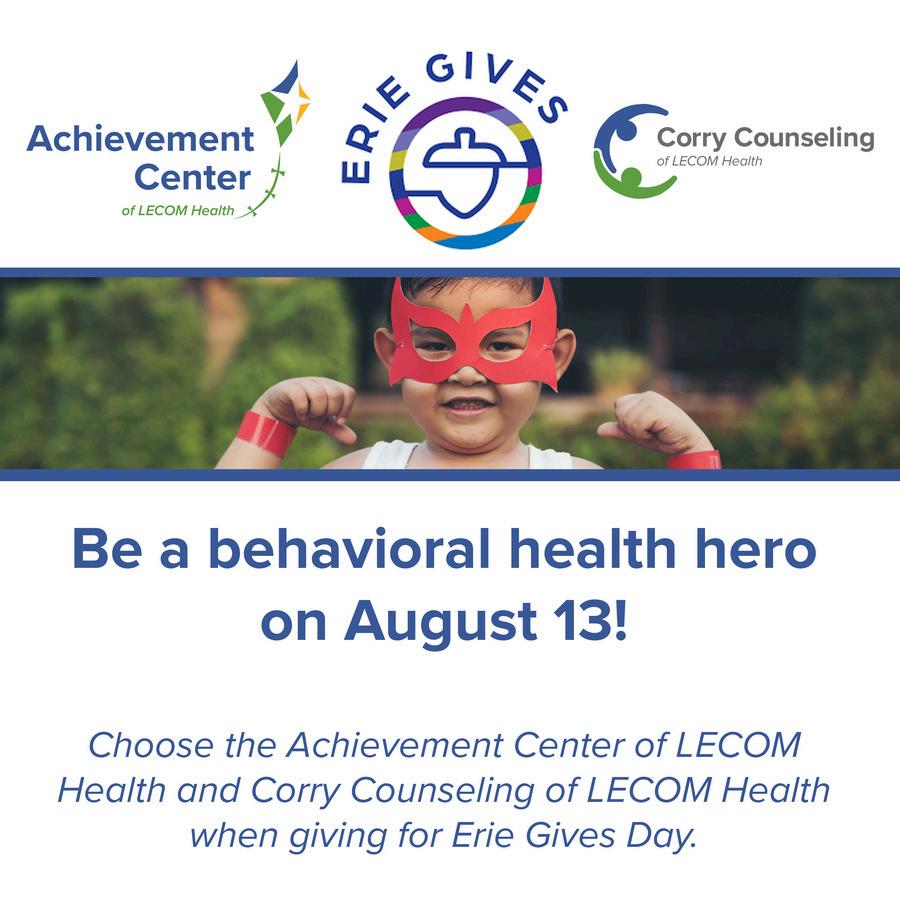 On Erie Gives Day, Aug 13, consider donating to the Achievement Center of LECOM Health and Corry Counseling of LECOM Health. Your donation will directly impact the children, adults, and families we serve.