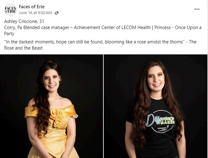 LECOM Behavioral Health Blended Case Manager Ashley Criscione is the most recent LECOM Health employee to be featured on the Faces of Erie Facebook page Halfprincess, half-behavioral health heroine, Ashley’s work within the Erie community makes her a full-time difference maker!
