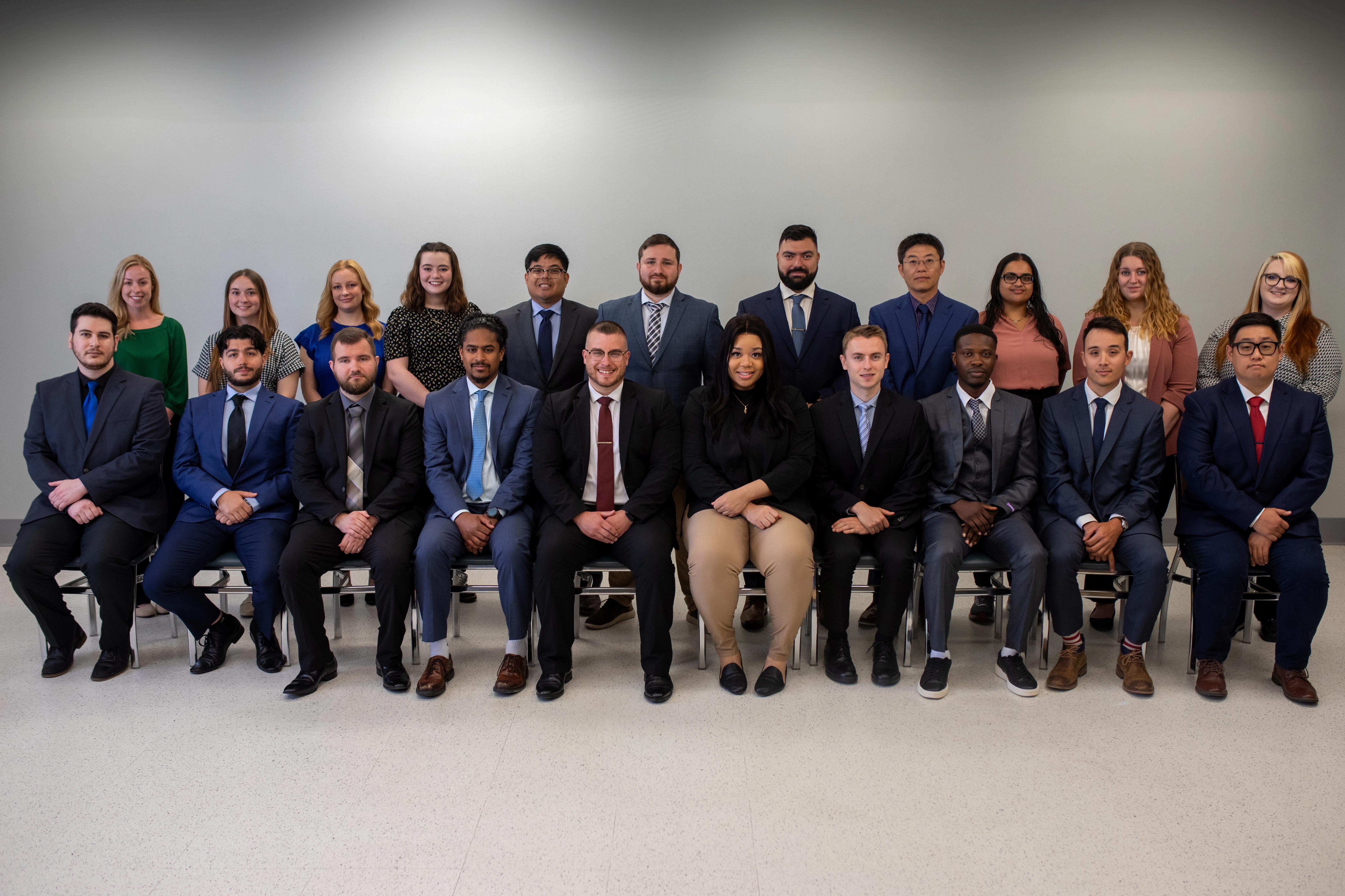 Back Row: Caleigh Adams, D.O., Transitional Year; Sarah Sinsebox, Pharm D, Pharmacy; Megan McQuaid, Pharm D, Pharmacy; Meghan Miller, Pharm D, Pharmacy; Carlo Magaway, D O , Transitional Year; Brandon Weiss, D O , Transitional Year; Karam Natsheh, D O , Transitional Year; Ping He, M D , Family Medicine; Anitha Anbalagan, D.P.M., Podiatric Medicine and Surgery; Felicia Sheesley, D.O., Transitional Year; Mallory Harold, D.O., Family Medicine