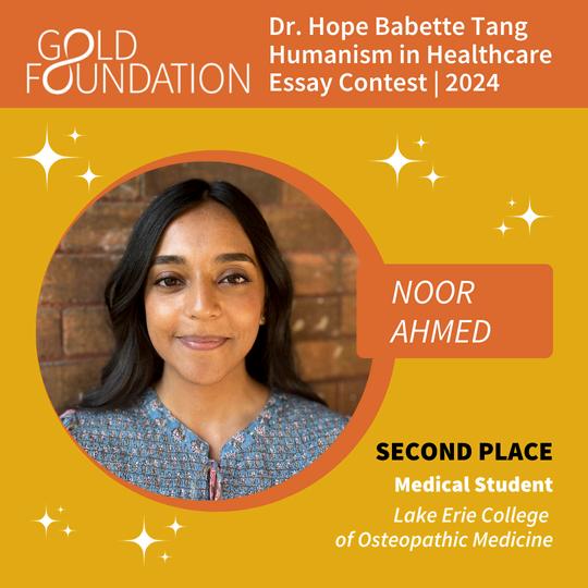 LECOM student Noor Ahmed’s essay, “Apartment 5 on Dolphin Drive,” was selected from nearly 500 submissions in the 2024 Dr. Hope Babette Tang Humanism in Healthcare Essay Contest to be published It will appear later this year in both “Academic Medicine” and the “Journal of Profes i l N i ”