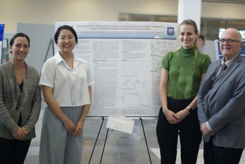 Second-year, LECOM Bradenton student, Min Chae, received an Outstanding Presentation Award at the 86th Annual Meeting of the Florida Academy of Sciences, held on March 10, 2023. The award-winning presentation highlighted a Robust Na+, K+-ATPase Activity Assay for the Evaluation of Synthetic Inhibitors: A Screen for Potential Migraine Mitigation Pharmaceuticals. The poster was presented with those of two fellow research members: second-year scholars, Emma Barnes and Morgan Hatlovic. All three students are pictured here with LECOM Bio-