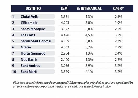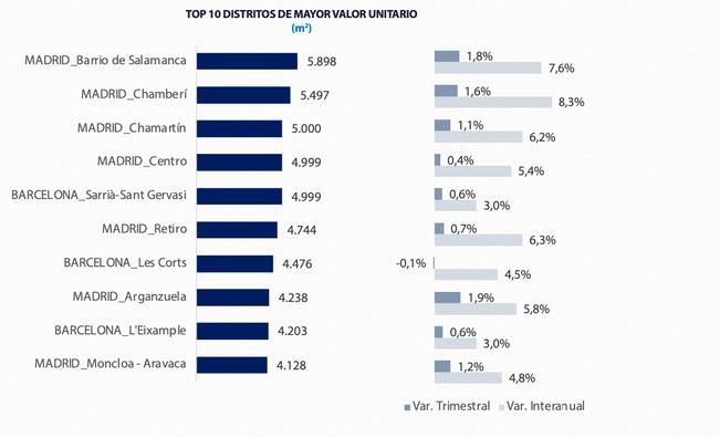 L'évolution des quartiers ayant les valeurs unitaires les plus élevées reflète un grand dynamisme, en particulier dans les quartiers de Madrid, et une stabilisation dans le cas de Barcelone Chamberí et Barrio de Salamanca à Madrid se distinguent par les plus fortes augmentations par rapport à l'année précédente.